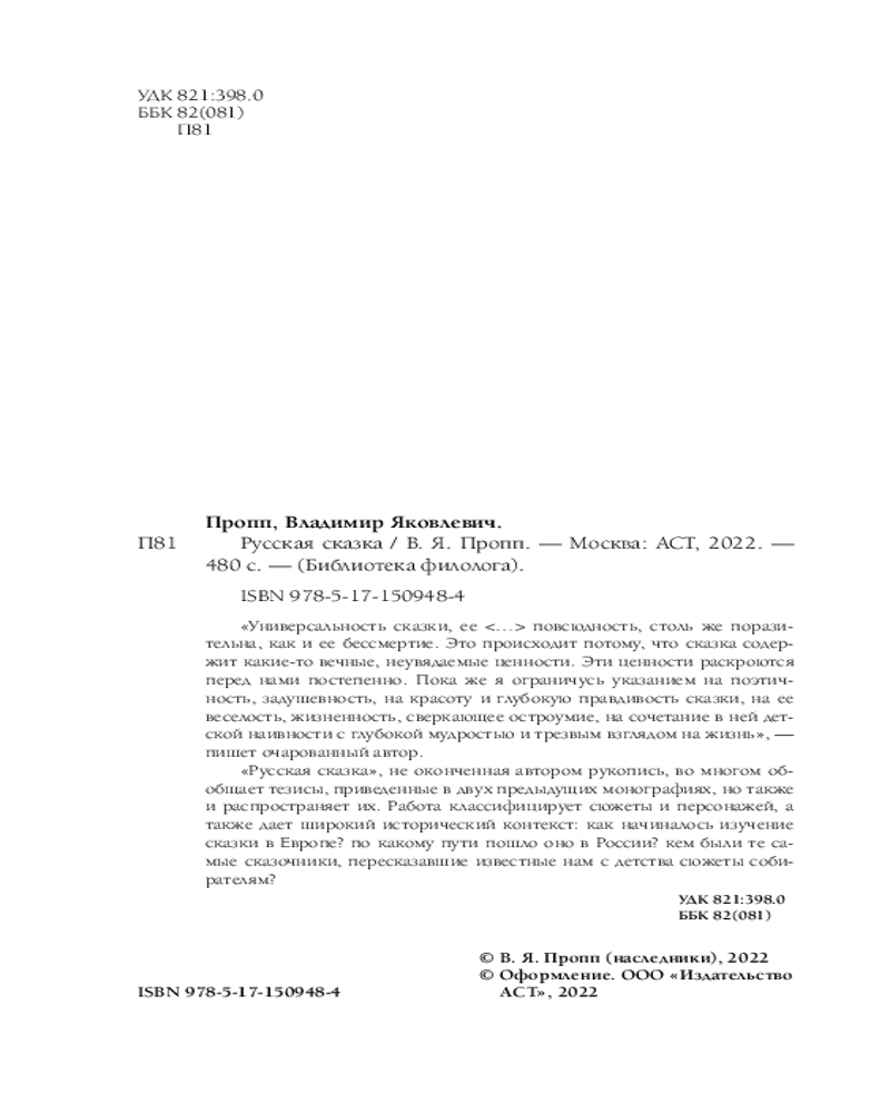 💳 Оплатить за товар можно при получении 🇰🇿 Есть бесплатная доставка по Казахстану от 1 дня 🎁 Копите бонусы с каждой покупки Серия: Библиотека филолога «Универсальность сказки, ее повсюдность, столь же поразительна, как и ее бессмертие. Это происходит потому, что сказка содержит какие-то вечные, неувядаемые ценности. Эти ценности раскроются перед нами постепенно. Пока же я ограничусь указанием на поэтичность, задушевность, на красоту и глубокую правдивость сказки, на ее веселость, жизненность, сверкающее остроумие, на сочетание в ней детской наивности с глубокой мудростью и трезвым взглядом на жизнь», — пишет очарованный автор. |