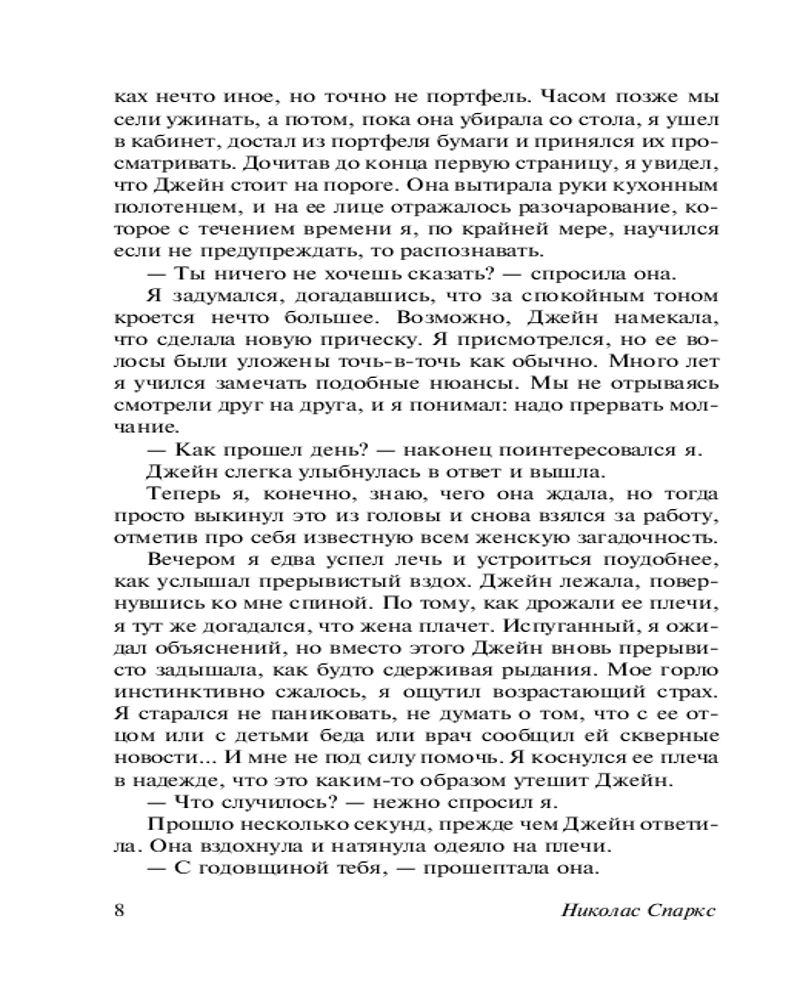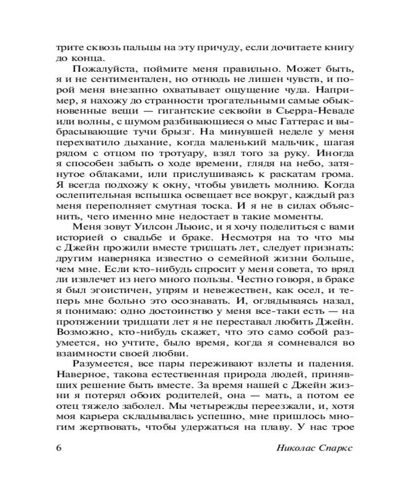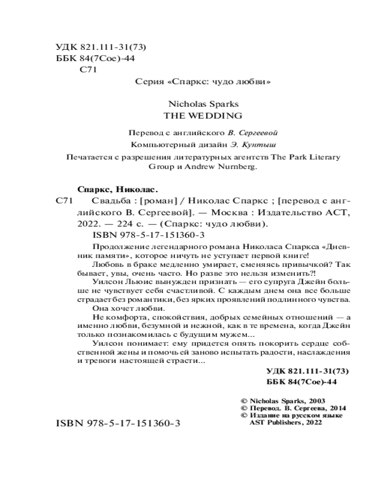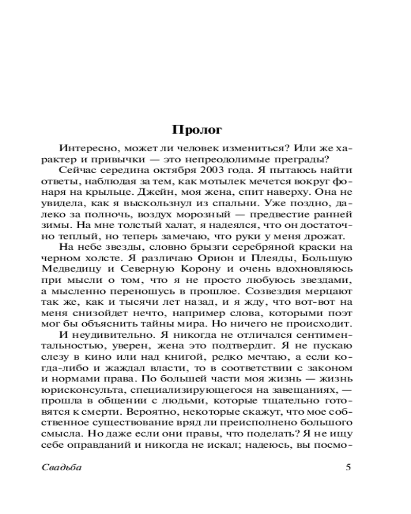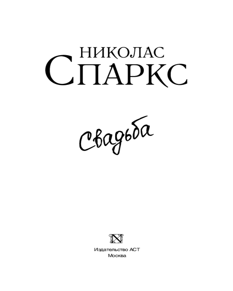 СвадьбаВ данный момент этот товар отсутствует в продаже. Возможно, у нас найдется аналогичный или похожий товар здесь. Серия: Спаркс: чудо любви (м) Продолжение легендарного романа Николаса Спаркса «Дневник памяти», которое ничуть не уступает первой книге! Любовь в браке медленно умирает, сменяясь привычкой? Так бывает, увы, очень часто. Но разве это нельзя изменить?! Уилсон Льюис вынужден признать — его супруга Джейн больше не чувствует себя счастливой. |