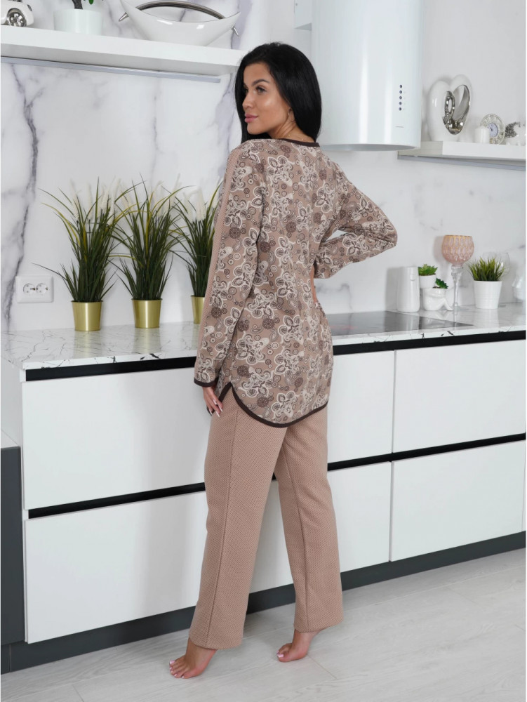 Модный в этом сезоне цвет.Обожаю оттенки коричневого.Теплый,слегка укоротила низ рукава и низ брюк..Мой размер 48,но заказала 52(50 не было).Слегка свободный,но спать удобно и свободно.