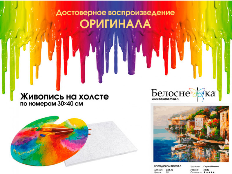 Рисуйте! Создавайте прекрасные сюжеты, станьте настоящим художником! С наборами Живопись на холсте это легко и просто, в комплекте есть все для работы над картиной на холсте. Просто возьмите стакан с водой и бумажную салфетку и время для творчества наступило. Основа картины — хлопковый холст на деревянном подрамнике с напечатанной схемой изображения. Холст загрунтован и полностью готов к нанесению краски, акриловые краски на водной основе экологически безопасны, номера на баночках соответствуют номерам на схеме. Количество красок достаточное для раскрашивания картины, даже в 2 слоя.