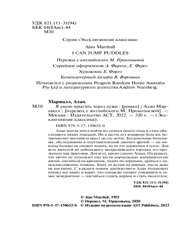 💳 Оплатить за товар можно при получении 🇰🇿 Есть бесплатная доставка по Казахстану от 1 дня 🎁 Копите бонусы с каждой покупки Серия: Эксклюзивная классика Алан всегда хотел пойти по стопам своего отца и стать объездчиком диких лошадей. Но в шесть лет коварная болезнь полиомиелит поставила крест на его мечте. Бесконечные больницы, обследования и неутешительный диагноз врачей — он никогда больше не сможет ходить, не то что держаться в седле. Для всех жителей их небольшого австралийского городка это прозвучало как приговор. |