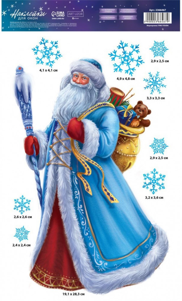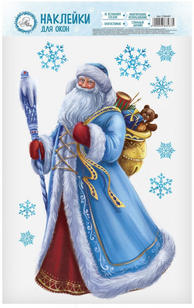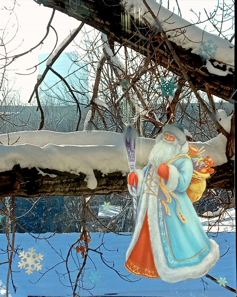 настолько красочный дед мороз ,даже кажется шуба у него настоящая. Без клея!!!думала будет отваливаться от стекла,крепко держится