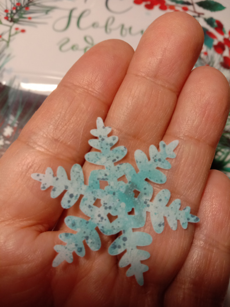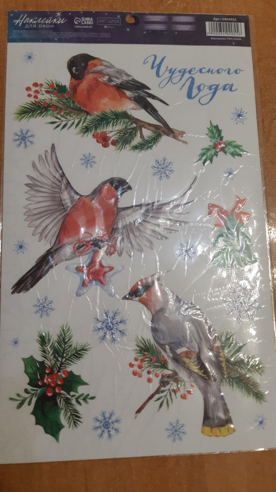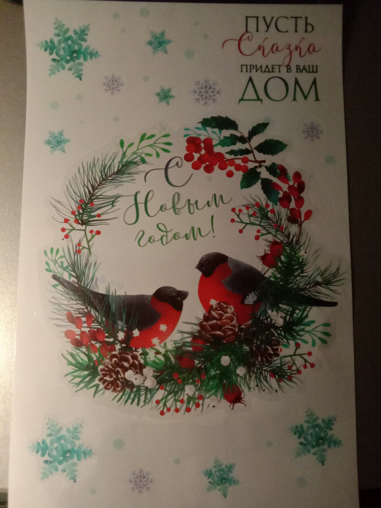 яркие снегири, голубые и фиолетовые снежинки, с обратной стороны рисунок не яркий. Очень понравились наклейки. Буду заказывать еще из этой серии