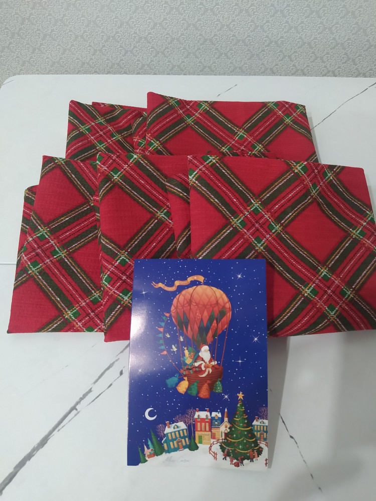 Хороший комплект в новогодних цветах, как на картинке. Купила к нему из этой же серии набор салфеток и дорожку на стол.