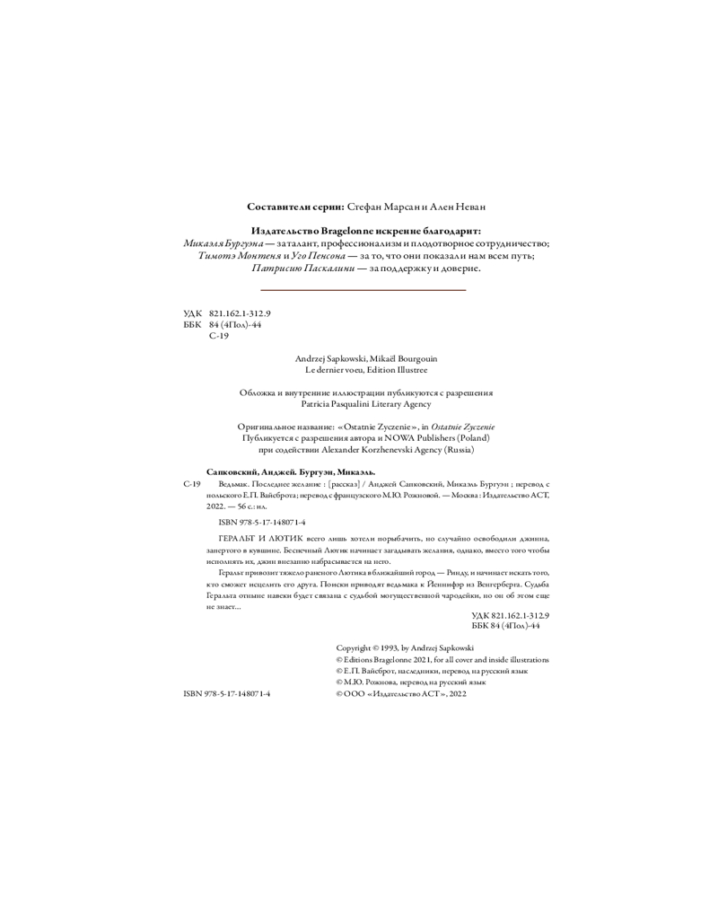 Ведьмак. Последнее желание с иллюстрациями Микаэля БургуэнаВ данный момент этот товар отсутствует в продаже. Возможно, у нас найдется аналогичный или похожий товар здесь. Серия: Сапковский с иллюстрациями. Подарочные издания Геральт и Лютик всего лишь хотели порыбачить, но случайно освободили джинна, запертого в кувшине. Беспечный Лютик начинает загадывать желания, однако, вместо того чтобы исполнять их, джин внезапно набрасывается на него. |