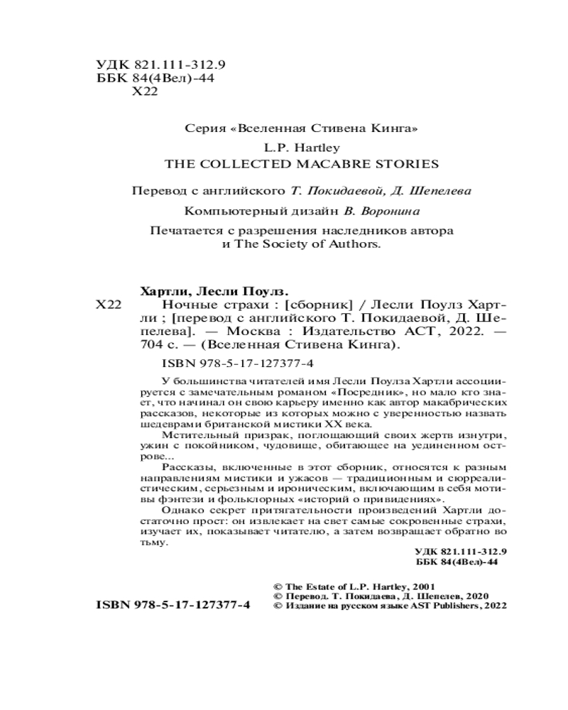 Серия: Вселенная Стивена Кинга У большинства читателей имя Лесли Поулза Хартли ассоциируется с замечательным романом «Посредник», но мало кто знает, что начинал он свою карьеру именно как автор макабрических рассказов, некоторые из которых можно с уверенностью назвать шедеврами британской мистики XX века.