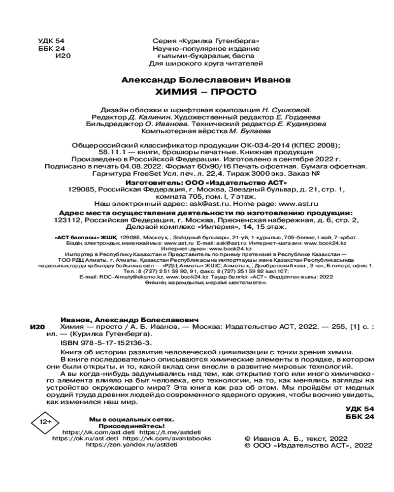 Серия: Курилка Гутенберга Книга об истории развития человеческой цивилизации с точки зрения химии. В книге последовательно описываются химические элементы в порядке, в котором они были открыты и какой вклад они внесли в развитие технологий на момент их открытия. Описывается: открытие, применение, некоторые забавные факты об элементе, основные свойства,которыми пользуется человек. |