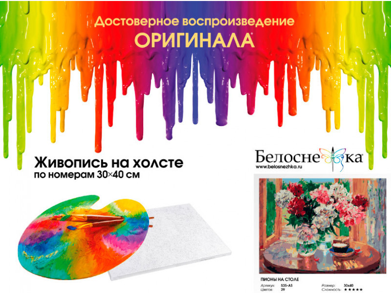 Мы любим цветы за их красоту и свежесть, потому что они способны приносить радость, а может они нам просто нравятся, на них приятно смотреть, а еще лучше их нарисовать. Набор для рисования по номерам от Белоснежки — это очаровательный сюжет в котором на первый план выходят цветы. Основа картины — хлопковый холст на деревянном подрамнике с напечатанной схемой изображения. Схема выполнена тонкими линиями серого цвета с номерами внутри областей — номера соответствуют цвету краски. Холст прогрунтован и полностью готов к нанесению краски. Набор комплектуется акриловыми красками на водной основе, которые не имеют запаха и являются безопасными.