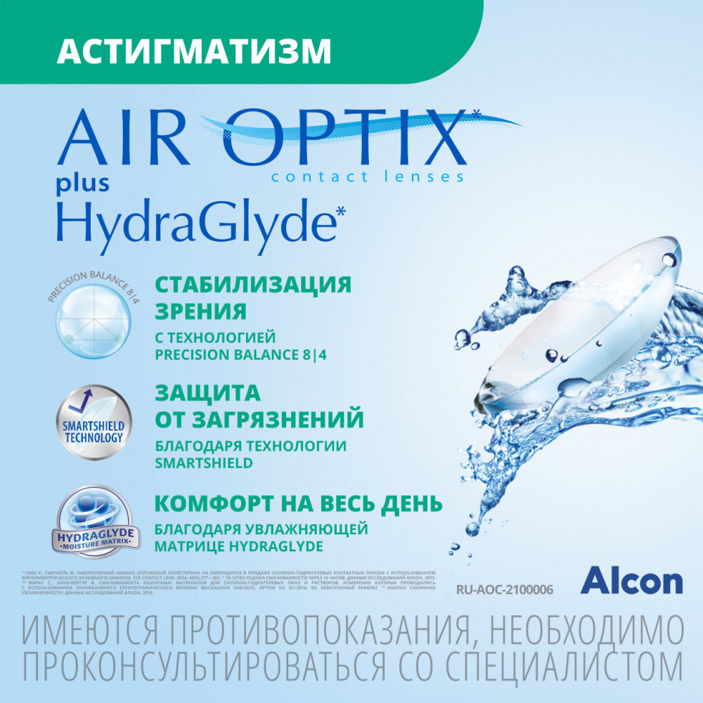 Линзы «Air Optix Plus HydraGlyde for Astigmatism» обеспечивают комфорт и четкое зрение для людей с астигматизмом. Особая форма позволяет линзе всегда оставаться на месте, а матрица HydraGlyde обеспечивает увлажнение и комфорт в течение всего срока ношения.