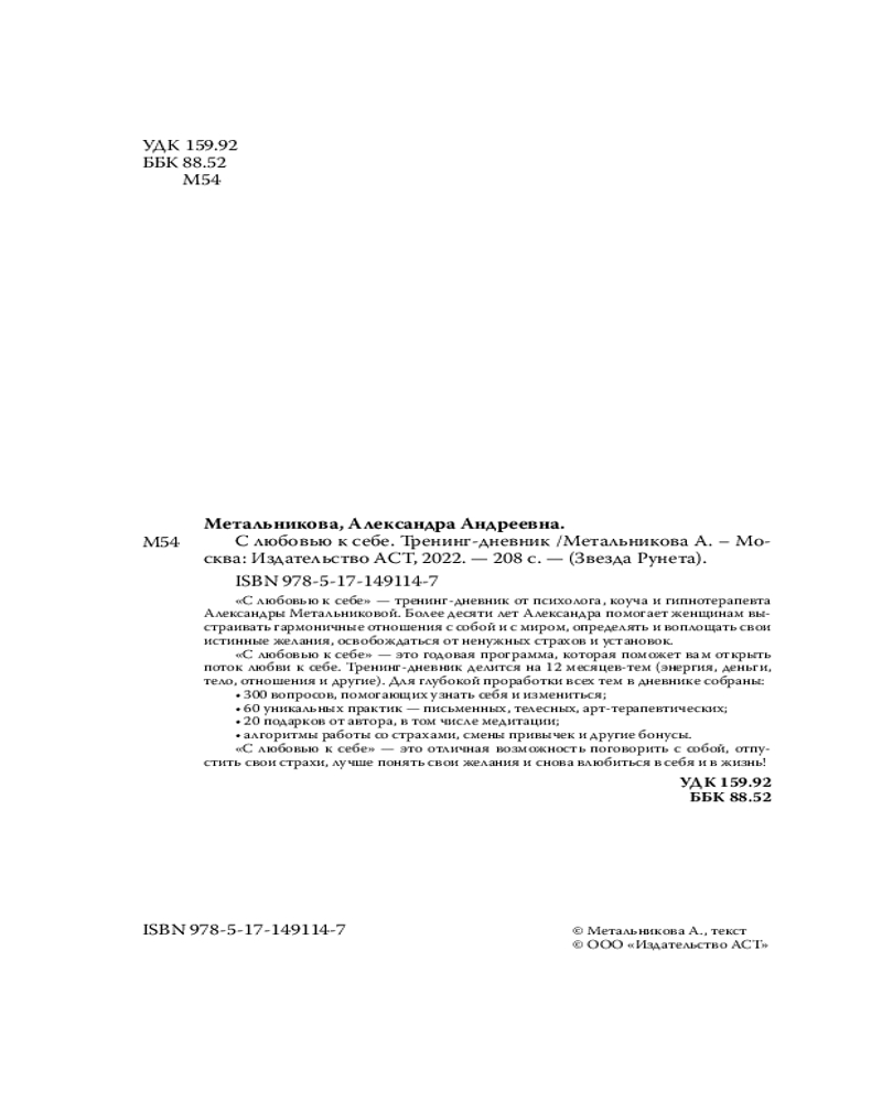 💳 Оплатить за товар можно при получении 🇰🇿 Есть бесплатная доставка по Казахстану от 1 дня 🎁 Копите бонусы с каждой покупки Серия: Звезда Рунета «С любовью к себе» — тренинг-дневник от психолога, коуча и гипнотерапевта Александры Метальниковой. Более десяти лет Александра помогает женщинам выстраивать гармоничные отношения с собой и с миром, определять и воплощать свои истинные желания, освобождаться от ненужных страхов и установок. «С любовью к себе» — это годовая программа, которая поможет вам открыть поток любви к себе. Тренинг-дневник делится на 12 месяцев-тем (энергия, деньги, тело, отношения и другие). |