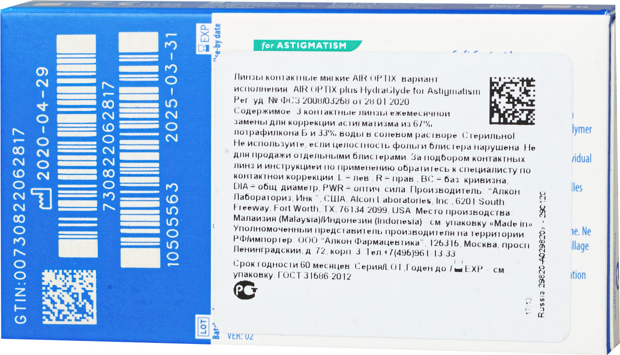 Линзы «Air Optix Plus HydraGlyde for Astigmatism» обеспечивают комфорт и четкое зрение для людей с астигматизмом. Особая форма позволяет линзе всегда оставаться на месте, а матрица HydraGlyde обеспечивает увлажнение и комфорт в течение всего срока ношения.