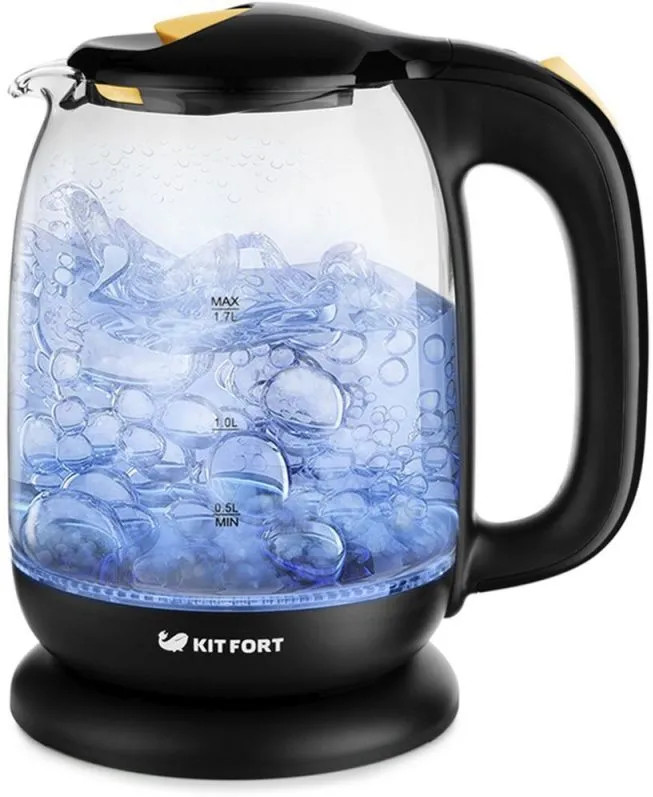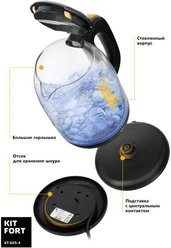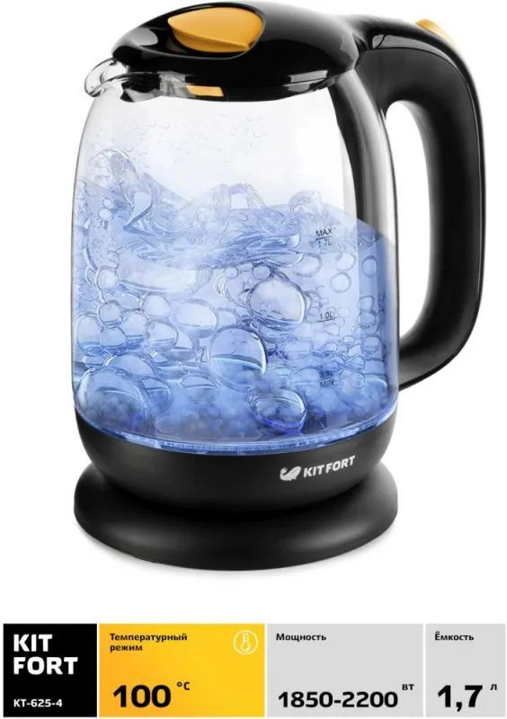 Прозрачный. Быстро и тихо закипает. Ярко светится.