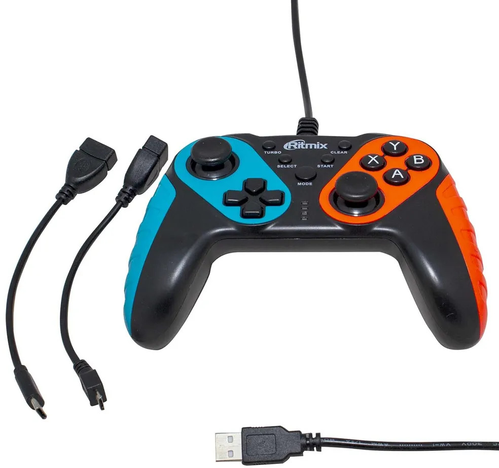 Проводной геймпад Ritmix GP-014 подключается к устройствам, на которых установлена операционная система Windows версии XP и выше, а также к смартфонам и планшетам на Android не ниже 5.0. В комплект входят кабели OTG, поэтому тебе не понадобится дополнительно покупать переходники.