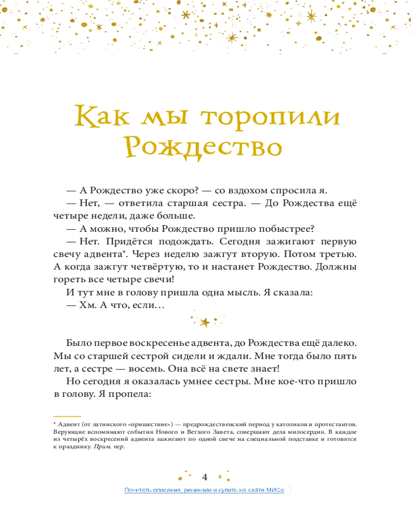 Ульф Нильсон — современный шведский сказочник — собрал в этой книге четыре истории о пряничных человечках, проказниках-гномах, елках и волшебстве, а проиллюстрировали их лучшие художники. Это невероятно тёплые, уютные и чудесные сказки. Читайте их по одной в каждую неделю декабря. |