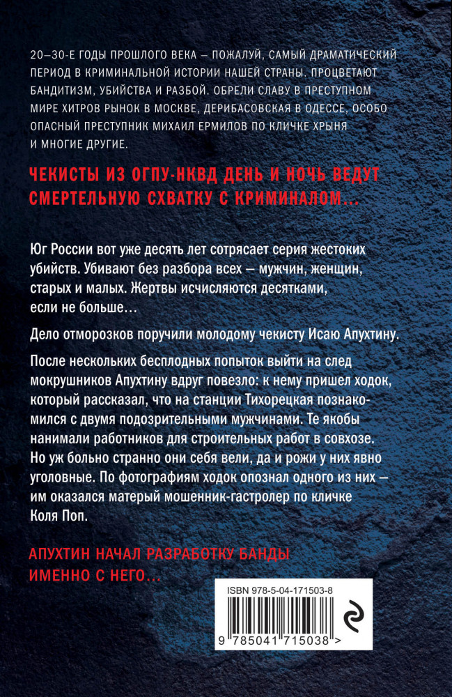 В данный момент этот товар отсутствует в продаже. Возможно, у нас найдется аналогичный или похожий товар здесь. Серия: Чекисты. Волки Сталина (обложка) В 20-30-х годах прошлого века страну захлестнула волна криминала. Подняли головы контрреволюционные элементы, процветают бандитизм, убийства и разбой. Чекисты из ОГПУ-НКВД день и ночь ведут смертельную схватку с криминалом...