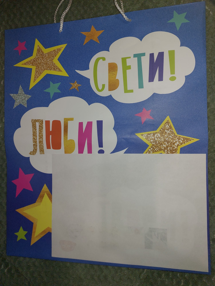 Очень красивый пакет. Брала на подарок, нужно было положить большую подушку, все вместилось. Матовый, яркий, броский. Подойдёт и взрослым, и детям. Для сравнения - фото с листочком формата А4