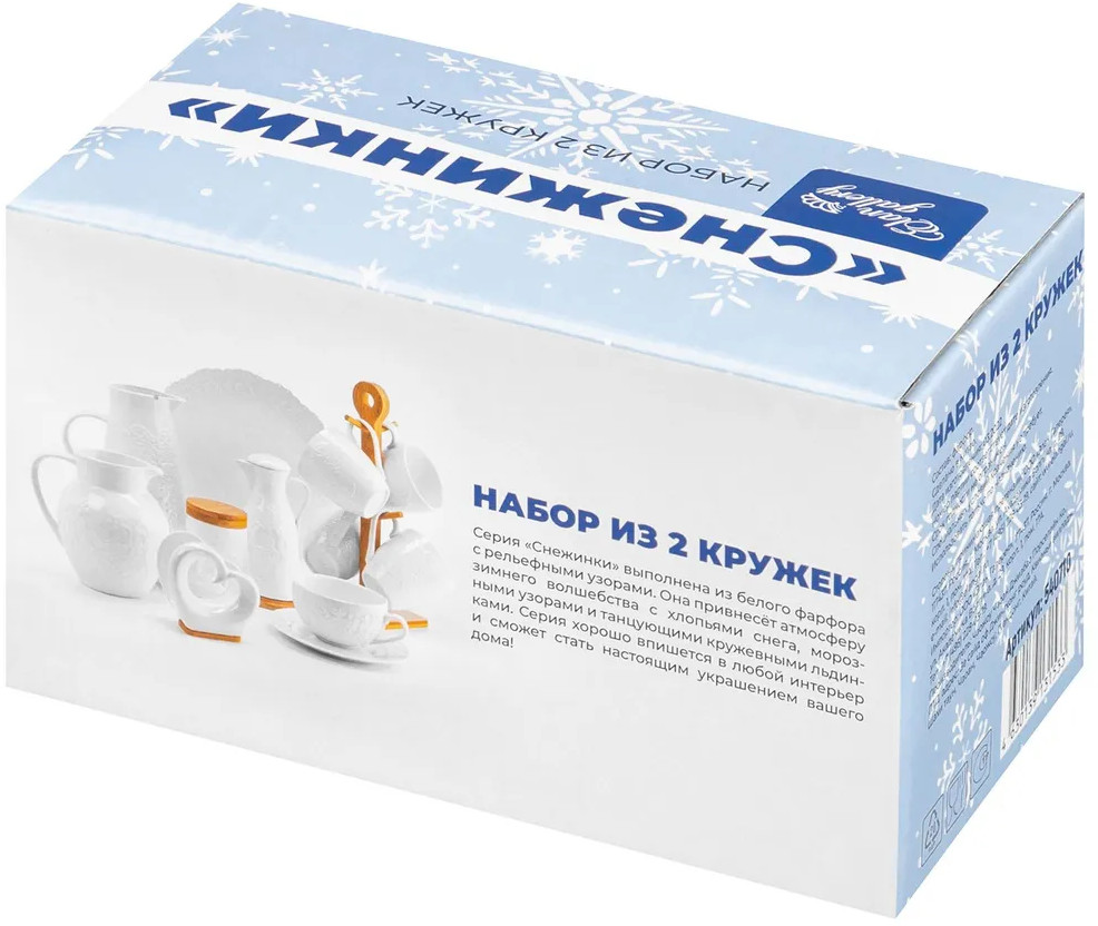 Набор серии «Снежинки» состоит из 2-х кружек. Набор кружек поможет провести множество приятных завтраков с капучино или латте, а также уютных чайных вечеров. Кружки выполнены из высококачественного фарфора и украшены декоративными рельефными узорами.