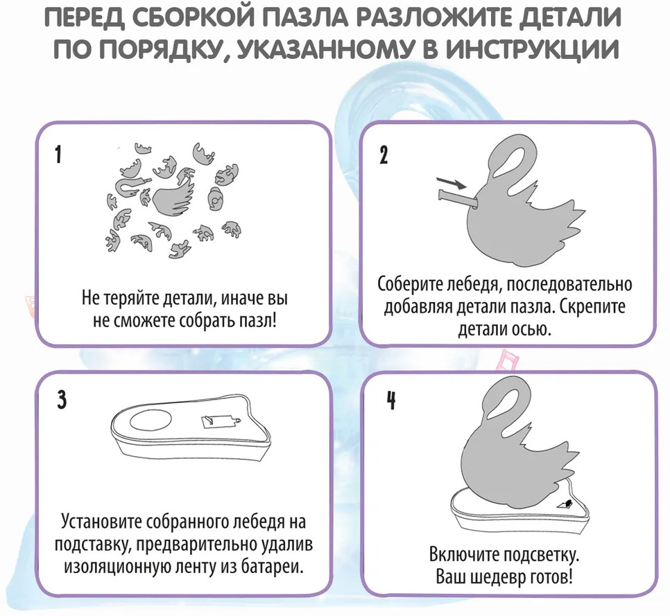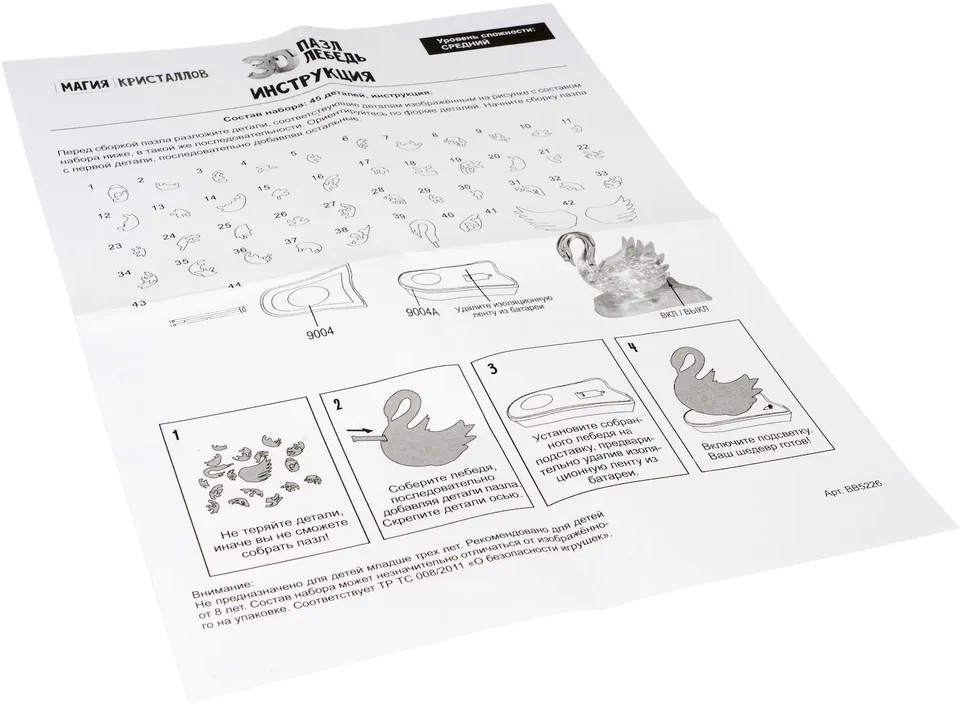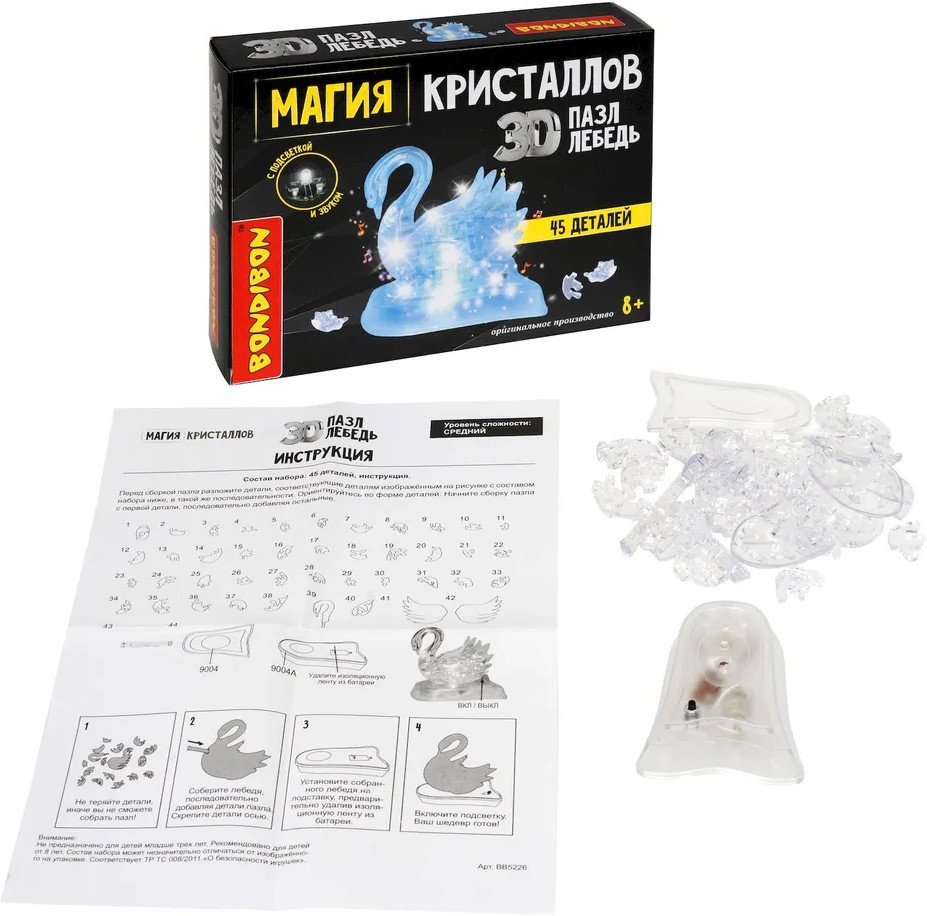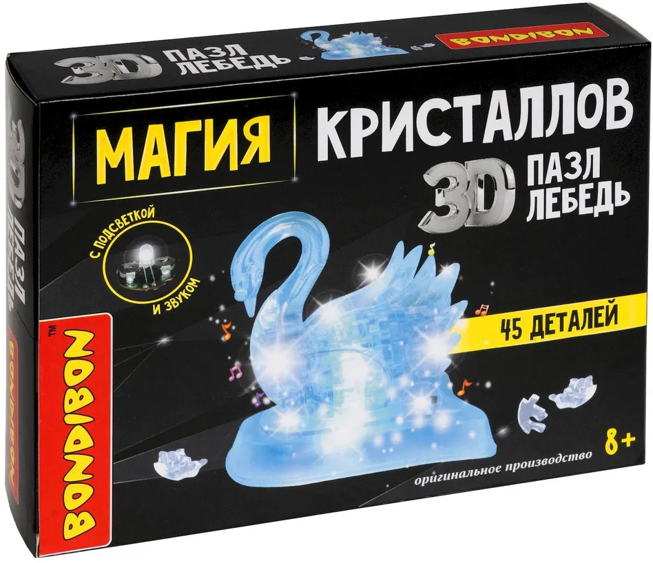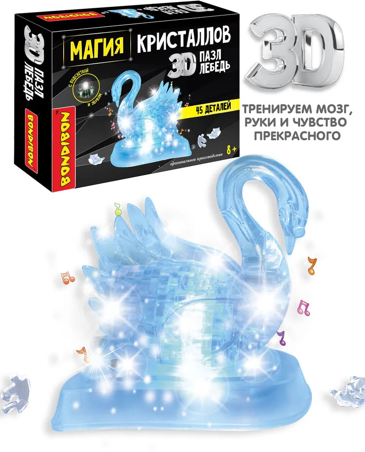 Пазл 3D «Лебедь» с подсветкой из серии «Магия кристаллов» Bondibon — это необычный набор с полупрозрачными деталями, с помощью которых можно создать фигуру в виде кристалла. Процесс сборки отлично развивает логику, пространственное мышление, внимание и мелкую моторику.
