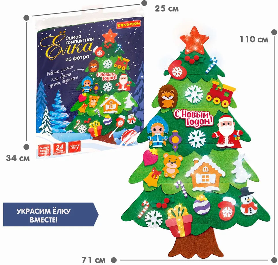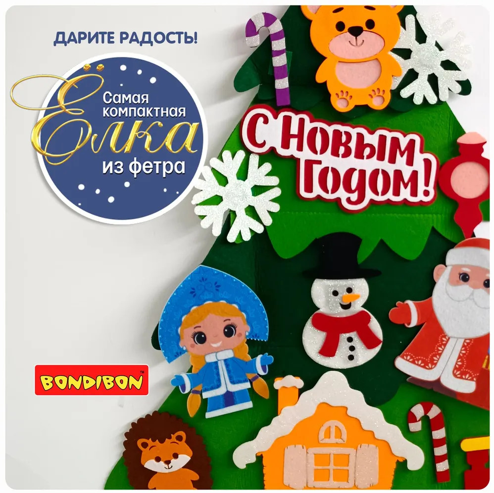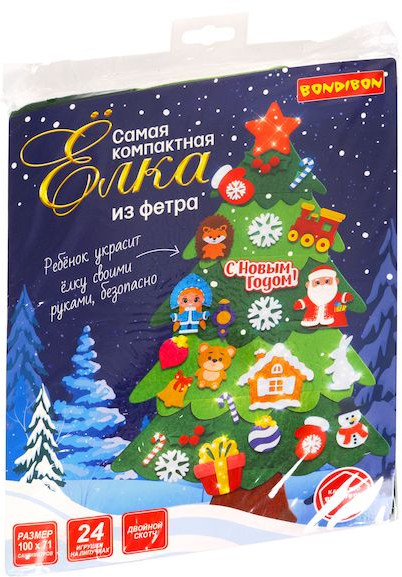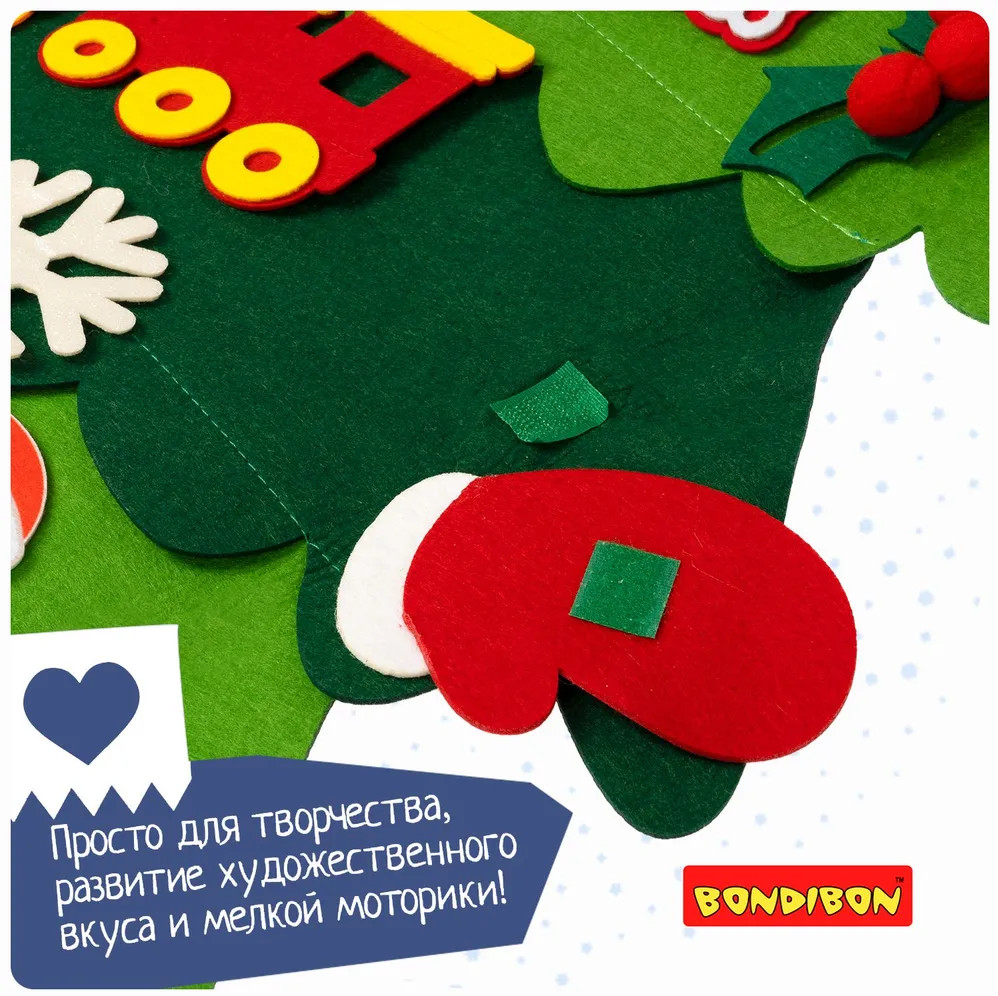 Без чего не может быть Нового года? Конечно же, без нарядной ёлки! Но когда дома малыши и домашние животные, критерии выбора главного символа праздника — безопасность и красота. Самая компактная ёлка Bondibon — и не нужно больше переживать, что ребёнок разобьёт игрушки. Ведь все игрушки из фетра на липучках! Яркую красивую ёлочку легко повесить на стену и увлекательно наряжать. Это не только красивое интерьерное украшение, но и развивающий набор для творчества. С ребёнком Вы можете сочинять различные истории, проговаривая названия игрушек. Тренируйте воображение, речь и мелкую моторику.