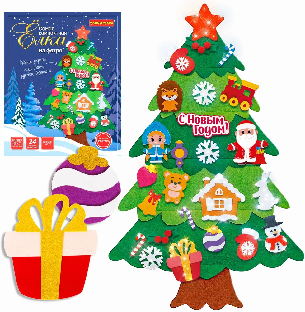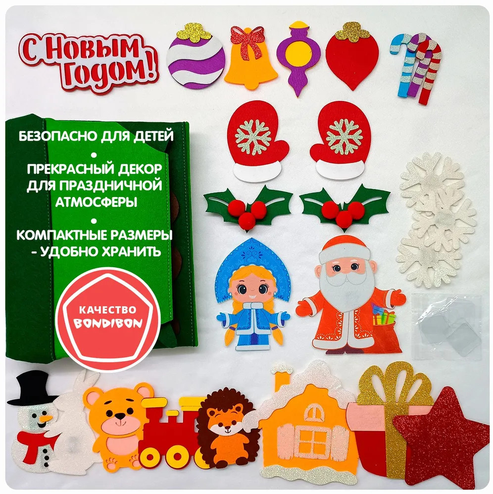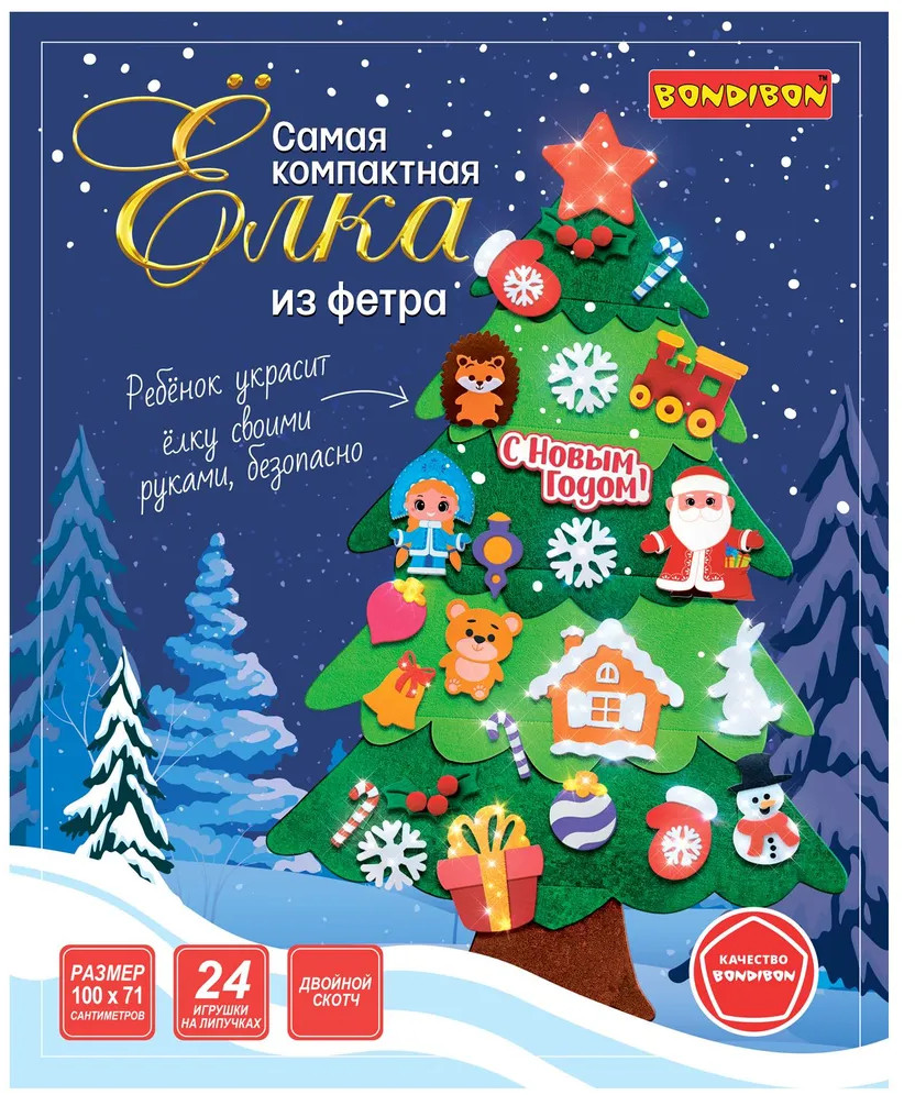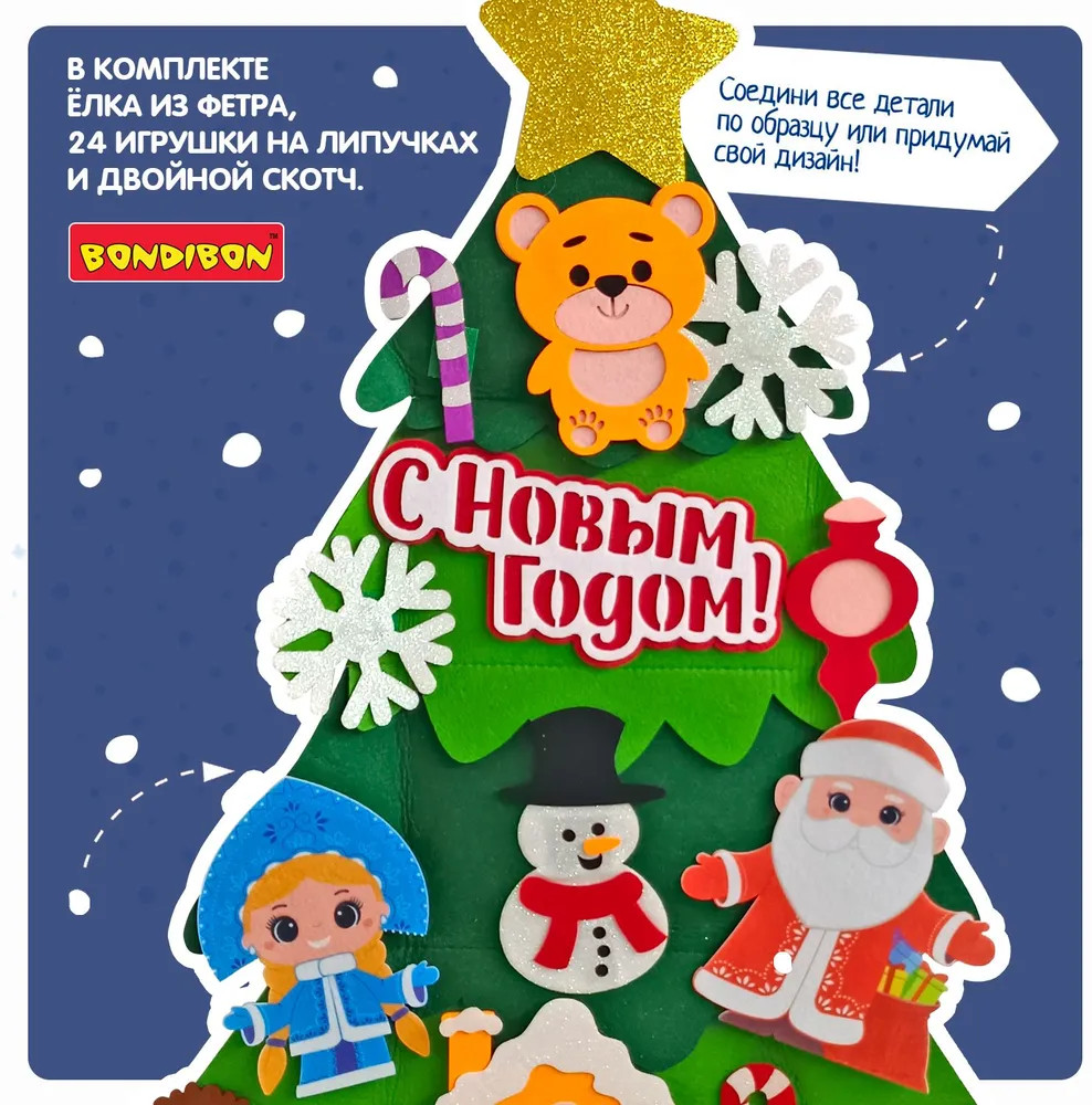 Без чего не может быть Нового года? Конечно же, без нарядной ёлки! Но когда дома малыши и домашние животные, критерии выбора главного символа праздника — безопасность и красота. Самая компактная ёлка Bondibon — и не нужно больше переживать, что ребёнок разобьёт игрушки. Ведь все игрушки из фетра на липучках! Яркую красивую ёлочку легко повесить на стену и увлекательно наряжать. Это не только красивое интерьерное украшение, но и развивающий набор для творчества. С ребёнком Вы можете сочинять различные истории, проговаривая названия игрушек. Тренируйте воображение, речь и мелкую моторику.