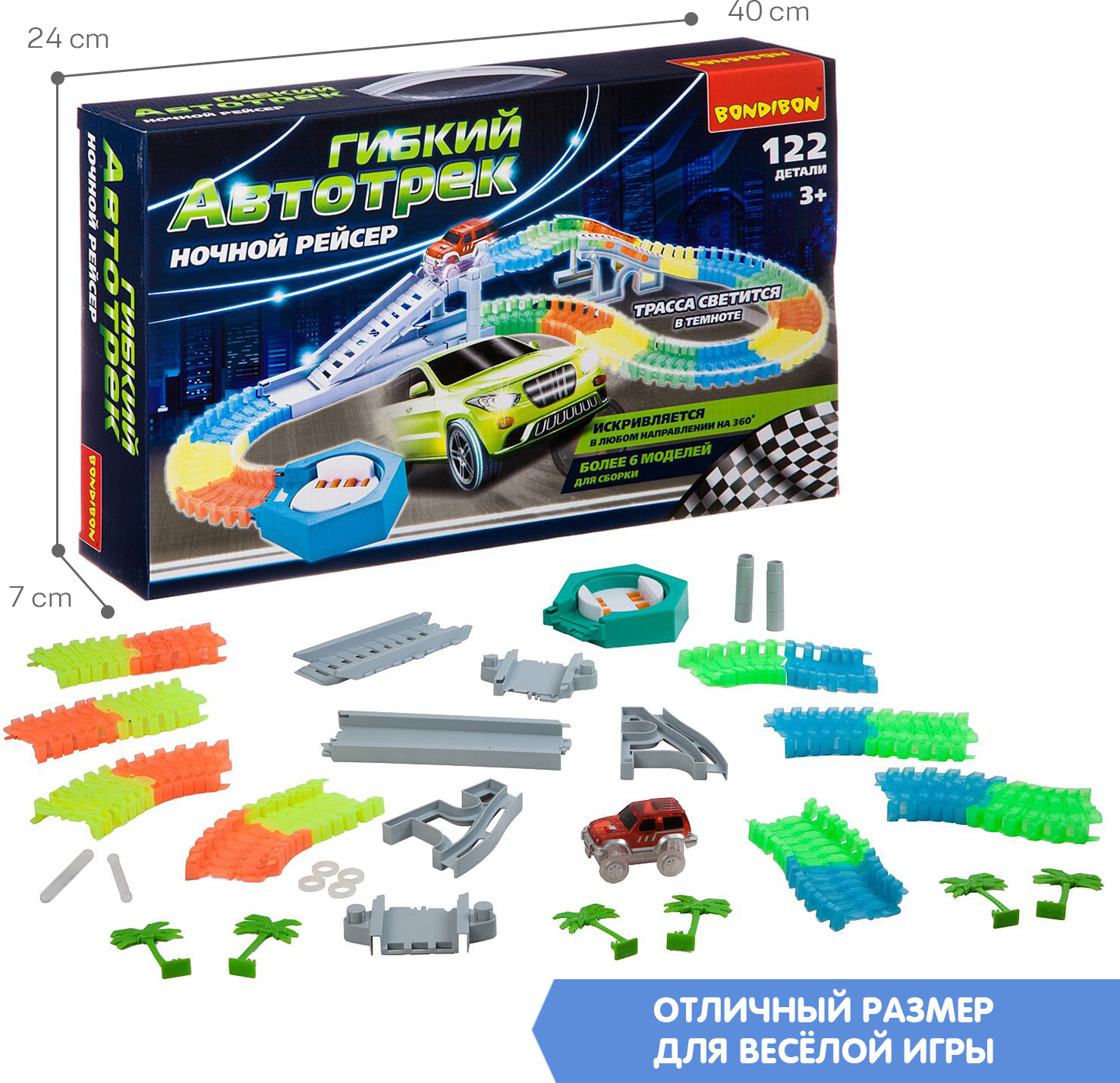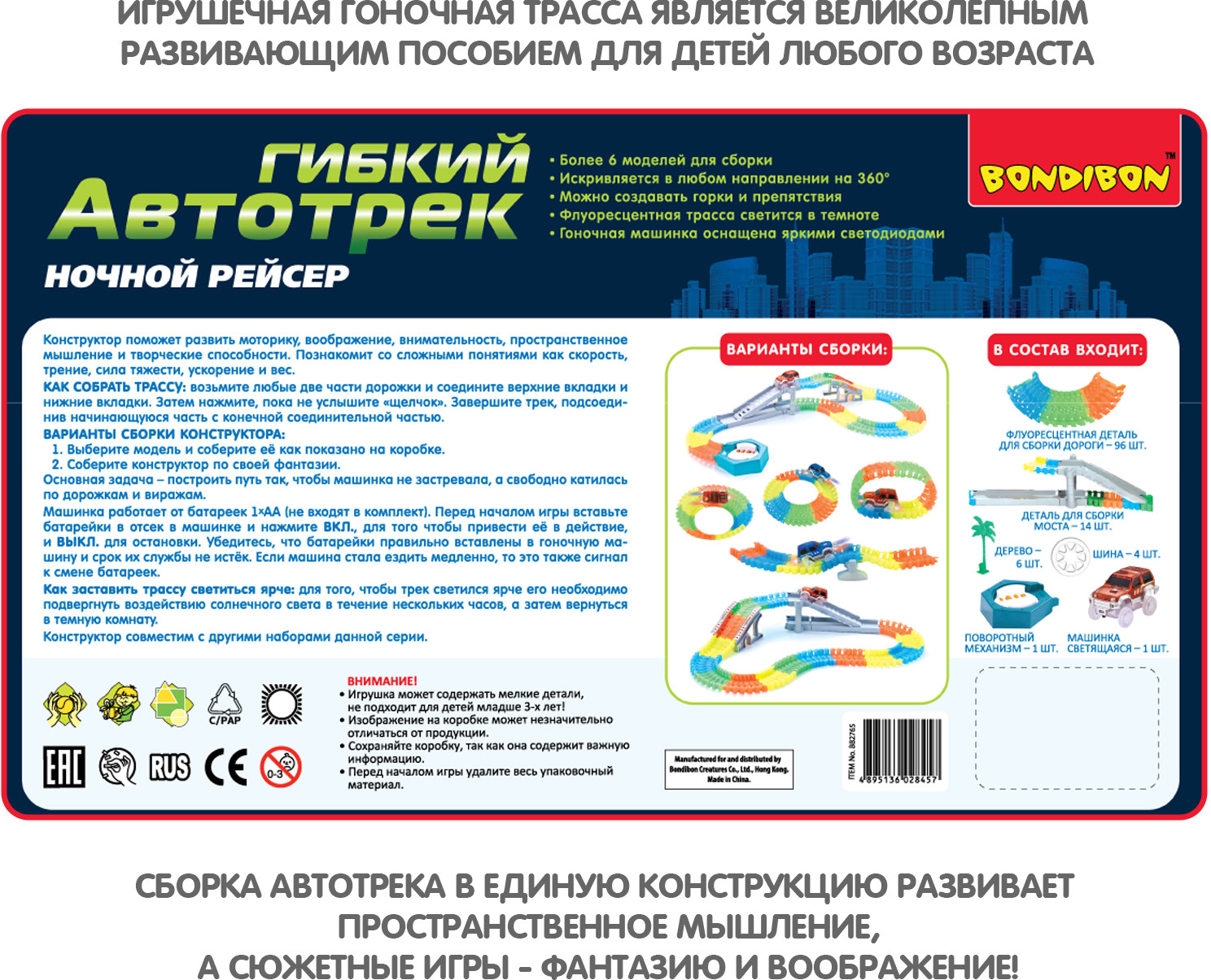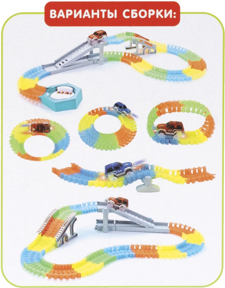 Конструктор поможет развить моторику, воображение, внимательность, пространственное мышление и творческие способности. Познакомит с такими понятиями как скорость, трение, сила тяжести, ускорение и вес. Более 6 моделей для сборки. Изгибается в любом направлении на 360 градусов. Можно создавать горки и препятствия. Флуоресцентная трасса светится в темноте. Гоночная машинка оснащена яркими светодиодами.