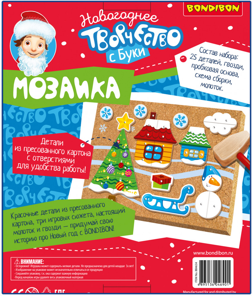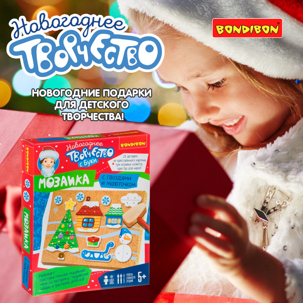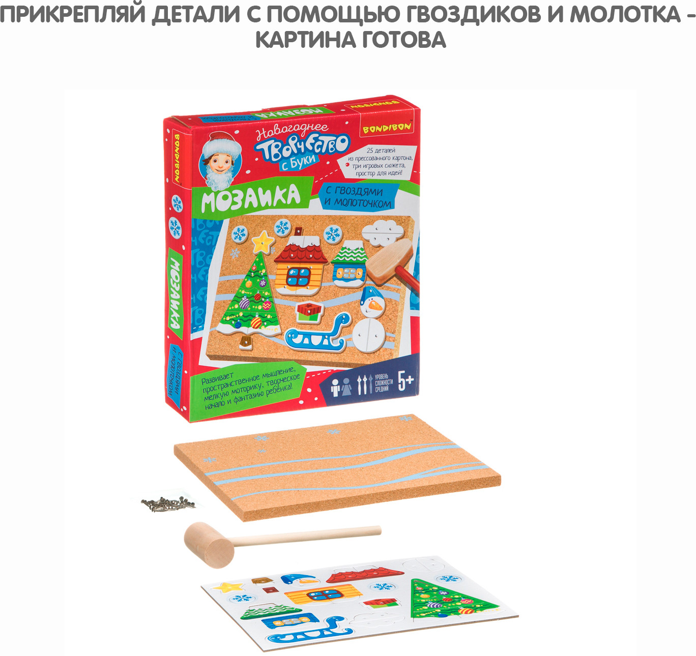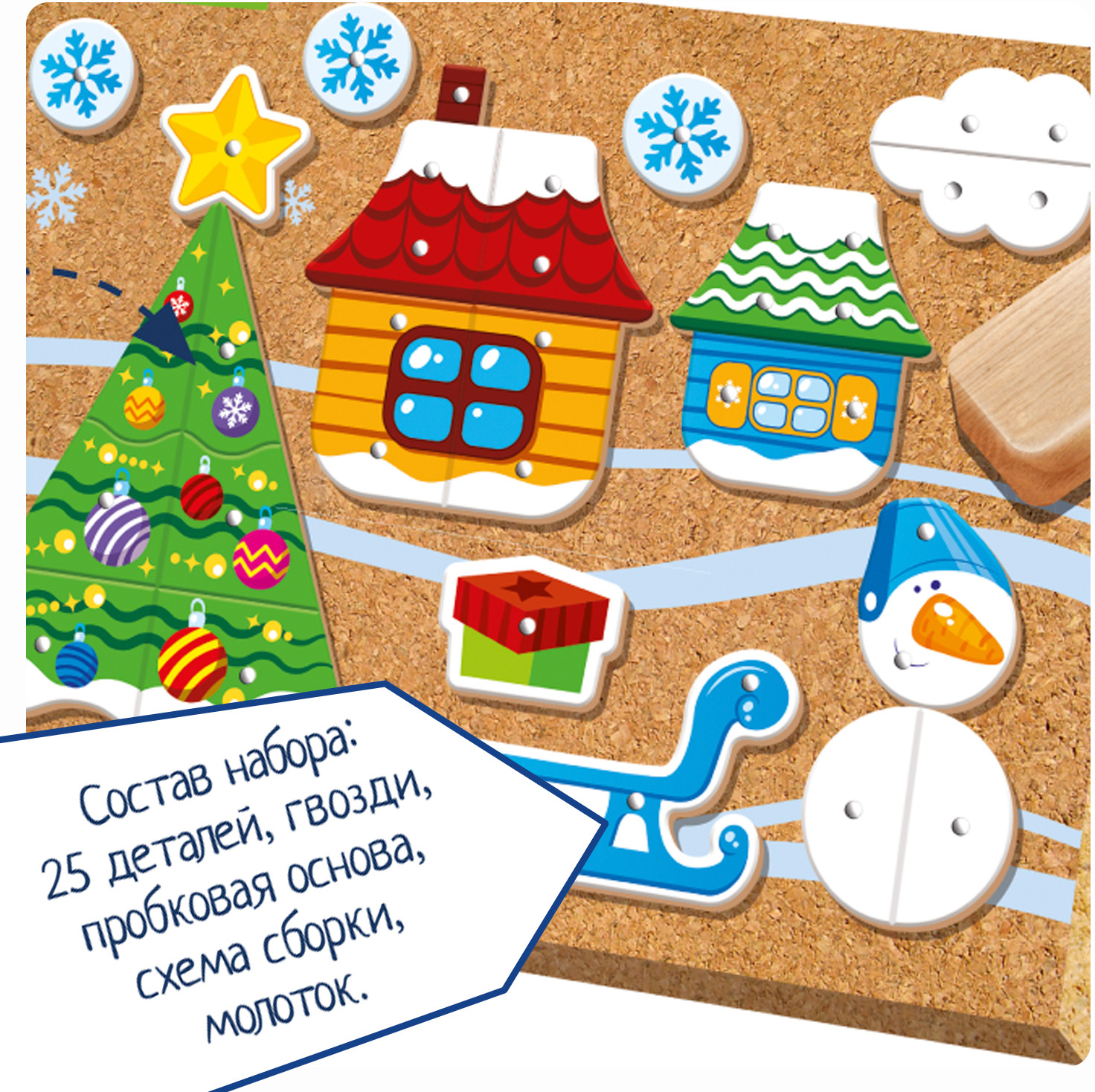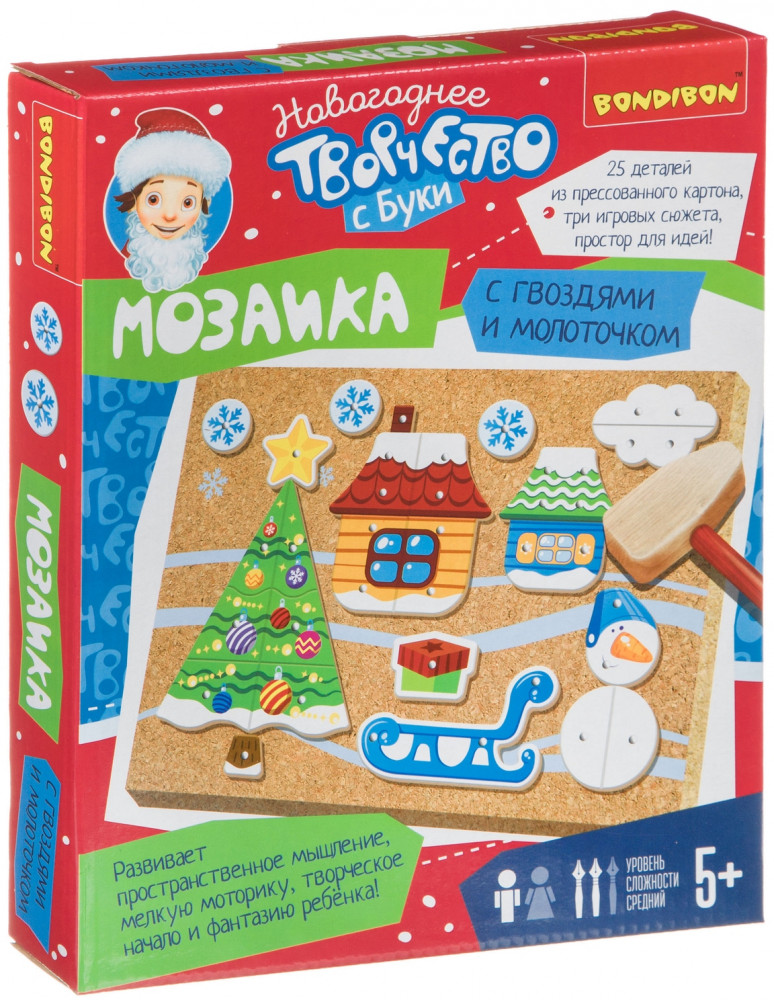 Увлекательная игра предполагает создание новогодней картины из деталей, прикрепляемых к основе с помощью гвоздиков. Особых усилий не требуется, детали содержат отверстия, остается лишь вставить гвоздики и прибить молотком! Также легко разобрать созданные картинки. Игра отлично тренирует мелкую моторику рук и глазомер ребенка, воображение и фантазию. Гвоздики в игре достаточно острые, поэтому, если Вы предложите игру маленькому ребенку, нужно, чтобы он постоянно находился под Вашим контролем.