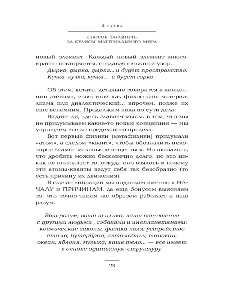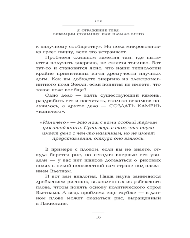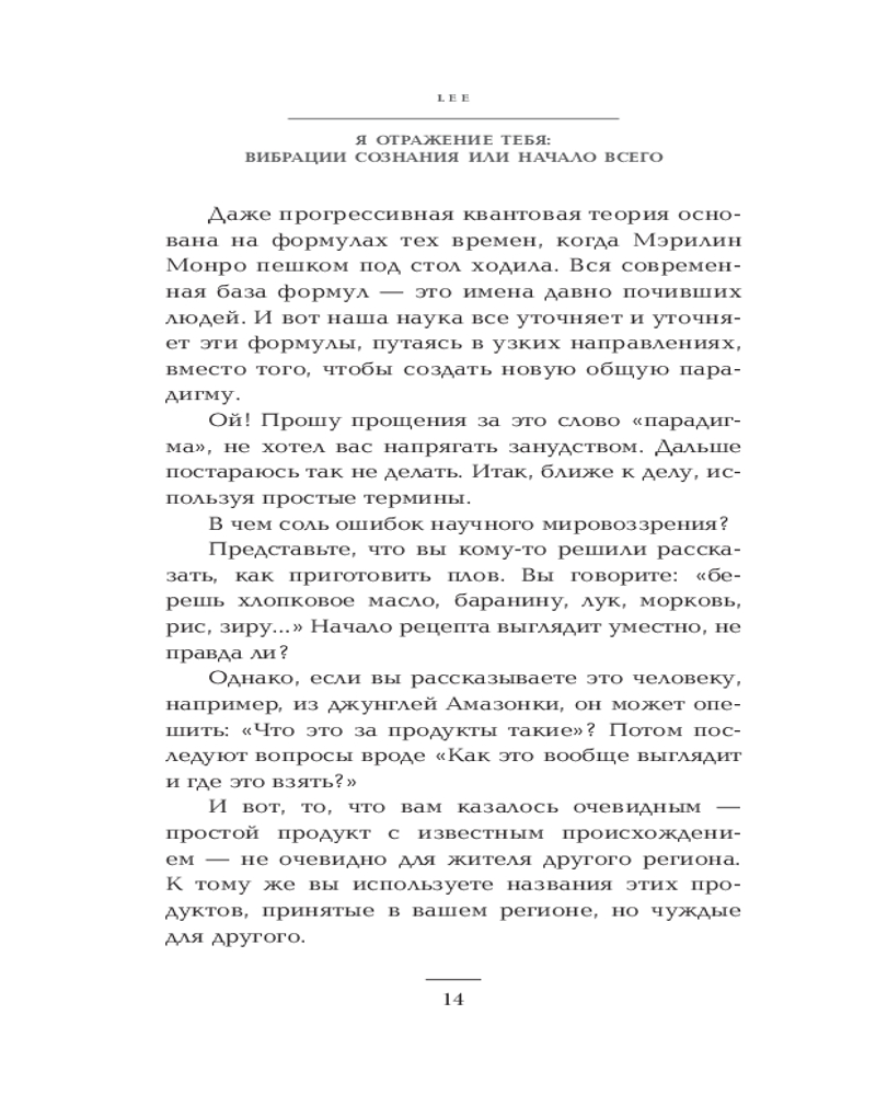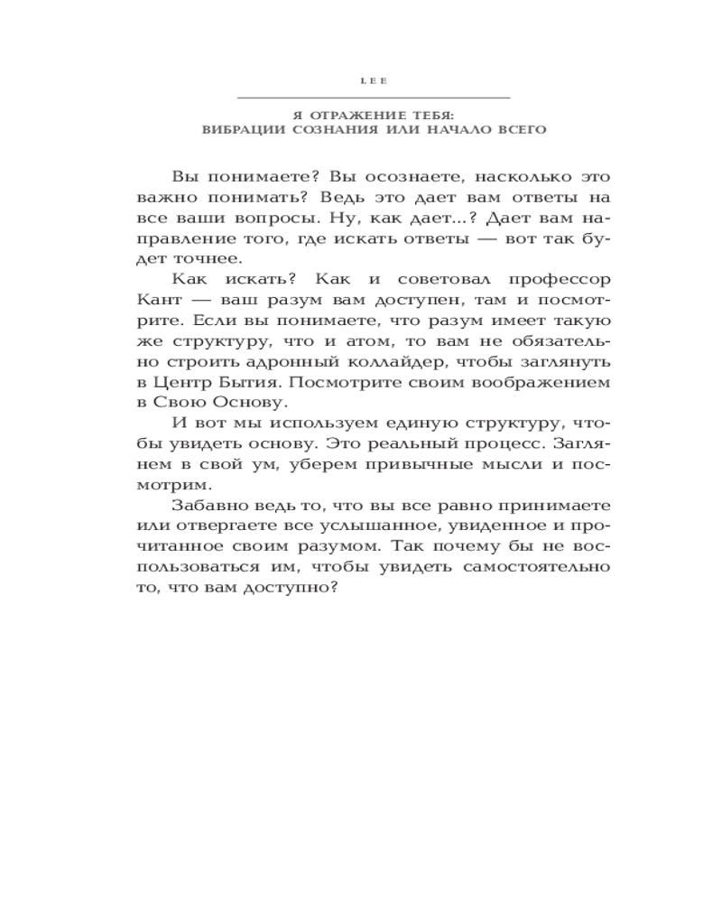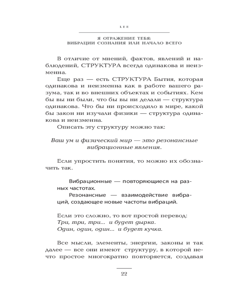 Я отражение тебя. Вибрации сознания или начало всегоВ данный момент этот товар отсутствует в продаже. Возможно, у нас найдется аналогичный или похожий товар здесь. Серия: Топ Рунета Автор lee — это практик, преподающий целостную систему знаний «Управление реальностью», которая опирается на базовое осознание человека «Кто я» и открывает его истинную суть — Творец своей реальности. Беря эту книгу в руки, вы получаете возможность ответить на вопросы о том, «с чего все началось», «каково мое место во Вселенной», «что такое вибрации», «куда и почему все движется». |