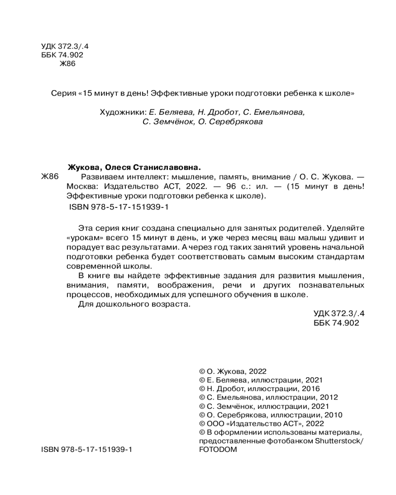 💳 Оплатить за товар можно при получении 🇰🇿 Есть бесплатная доставка по Казахстану от 1 дня 🎁 Копите бонусы с каждой покупки Серия: 15 минут в день! Эффективные уроки подготовки ребенка к школе Эта серия книг создана специально для занятых родителей. Уделяйте «урокам» всего 15 минут в день, и уже через месяц ваш малыш удивит и порадует вас результатами. А через год таких занятий уровень начальной подготовки ребенка будет соответствовать самым высоким стандартам современной школы. В книге вы найдете эффективные задания для развития мышления, внимания, памяти, воображения, речи и других познавательных процессов, необходимых для успешного обучения в школе. Для дошкольного возраста. |