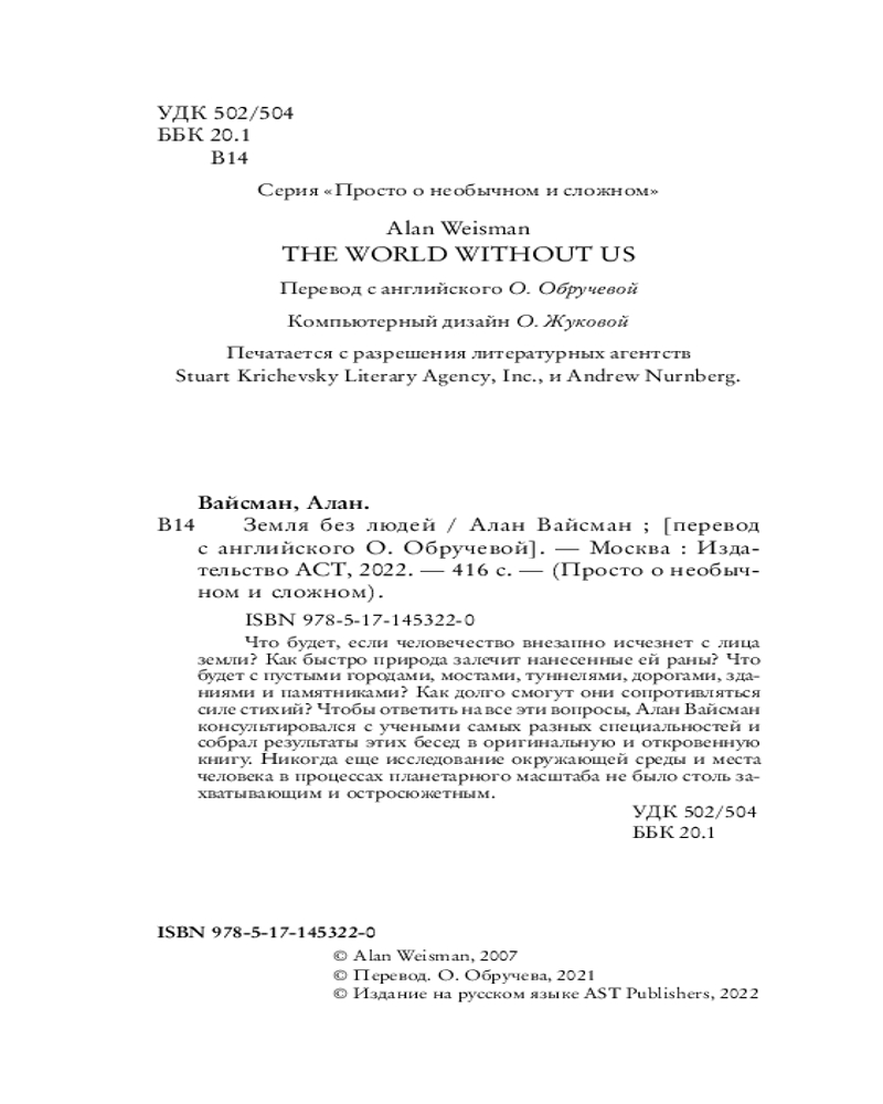 💳 Оплатить за товар можно при получении 🇰🇿 Есть бесплатная доставка по Казахстану от 1 дня 🎁 Копите бонусы с каждой покупки Серия: Просто о необычном и сложном Что будет, если человечество внезапно исчезнет с лица земли? Как быстро природа залечит нанесенные ей раны? Что будет с пустыми городами, мостами, туннелями, дорогами, зданиями и памятниками? Как долго смогут они сопротивляться силе стихий? Чтобы ответить на все эти вопросы, Алан Вайсман консультировался с учеными самых разных специальностей и собрал результаты этих бесед в оригинальную и откровенную книгу. Никогда еще исследование окружающей среды и места человека в процессах планетарного масштаба не было столь захватывающим и остросюжетным. |