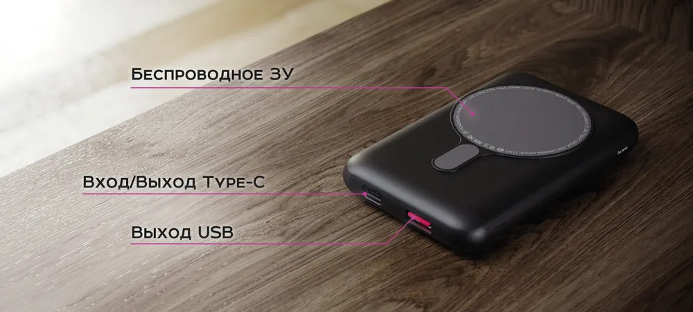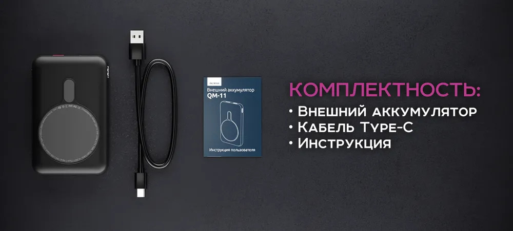 Беспроводной магнитный внешний аккумулятор — Olmio QM-11. PowerBank поддерживает технологию MagSafe и примагничивается к девайсам APPLE, либо к чехлам, обладающими этой технологией. Благодаря разъему Type-C, Вы сможете обойтись одним кабелем в повседневной жизни. Если же необходимо зарядить два устройства, то к Вашим услугам еще один разъем — стандартный USB 2.0.
