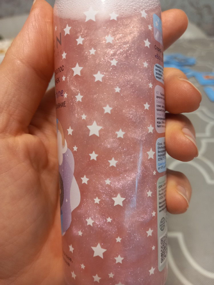 Хороший спрей. Приятный, не навязчивый аромат. На волосах долго не держится. Дочка от него не чихает, аллергии не вызвал. Облегчает расчесывание. Блёстки маленькие, розовые, не стойкие, остаются на волосах не на долго. Рекомендую.