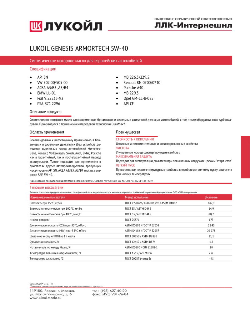 Лукойл Моторное масло Лукойл Genesis Armortech 5W-40