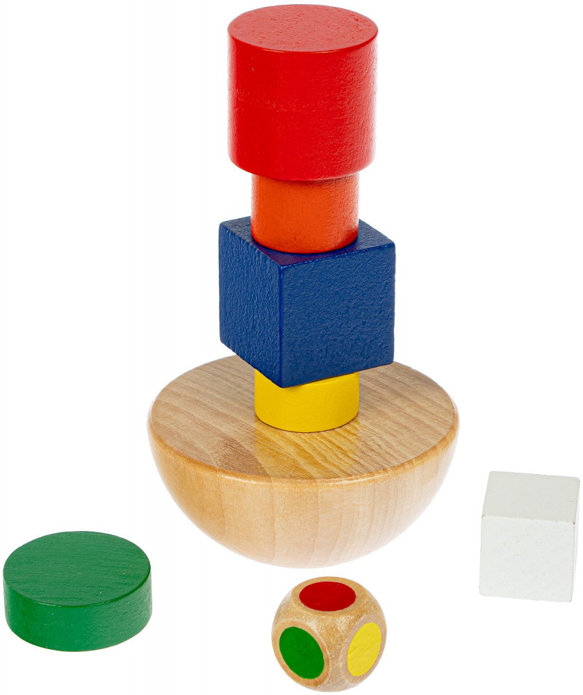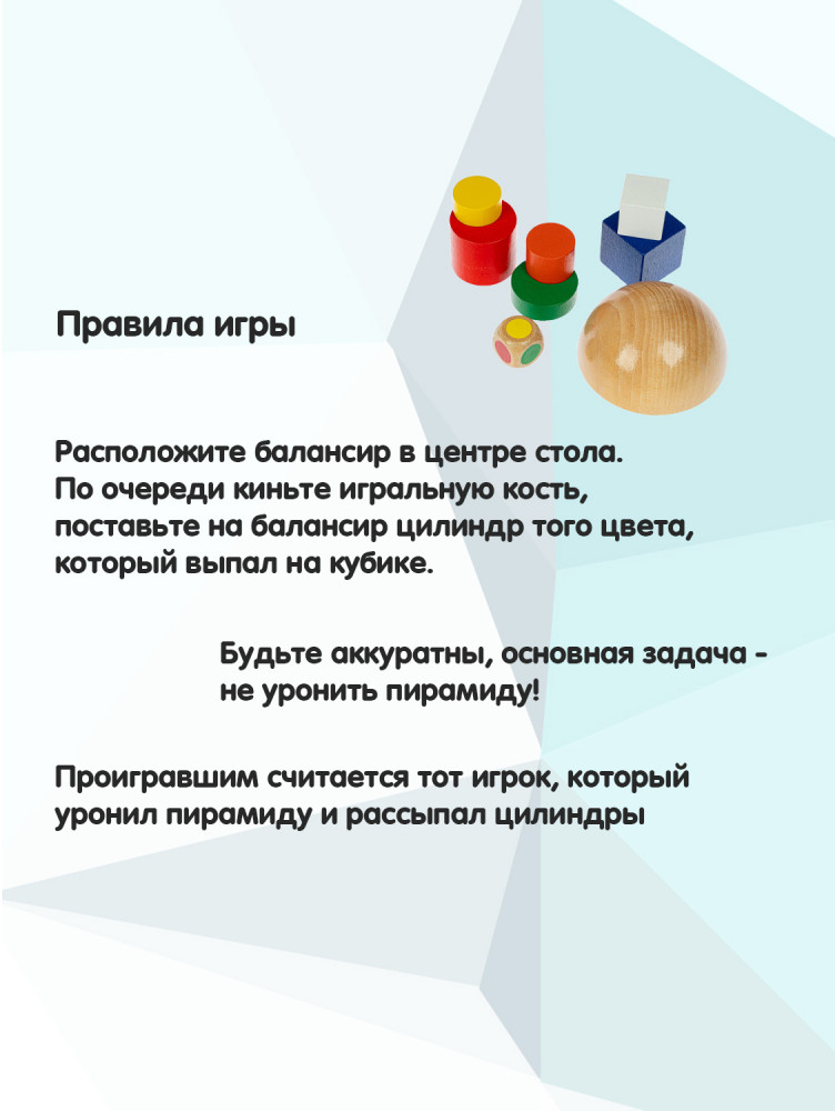 Расположите балансир в центре стола. По очереди киньте игральную кость, поставьте на балансир цилиндр того цвета, который выпал на кубике. Будьте аккуратны, основная задача — не уронить пирамиду! Проигравшим считается тот игрок, который уронил пирамиду и рассыпал цилиндры.
