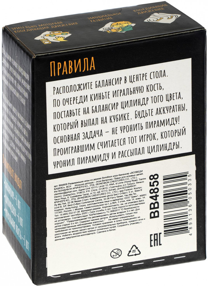 Деревянная настольная игра-балансир «Возведи башню» от Bondibon развивает координацию движений, пространственное мышление, мелкую моторику рук, концентрацию внимания и воображение ребенка. Она познакомит вашего малыша с азами равновесия и поможет изучить цвета. Все составляющие элементы настольных игр серии «Развивающие игры из дерева» выполнены из экологически чистого материала — дерева, обработанного безопасными красками.