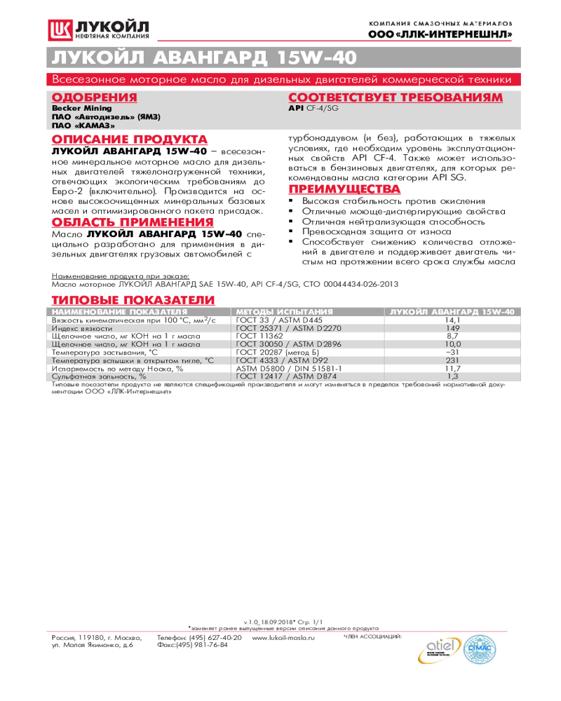 В данный момент этот товар отсутствует в продаже. Возможно, у нас найдется аналогичный или похожий товар здесь. Серия: Avantgarde Лукойл Avantgarde 15W-40 — всесезонное универсальное моторное масло для дизельных двигателей тяжелонагруженной техники, отвечающих экологическим требованиям до Евро-2 (включительно).