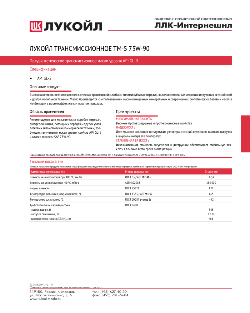 Лукойл Трансмиссионное масло Лукойл ТМ-5 75W-90