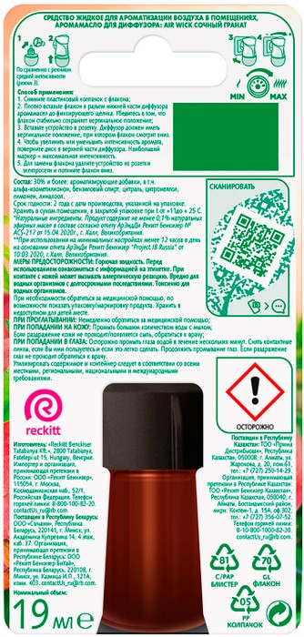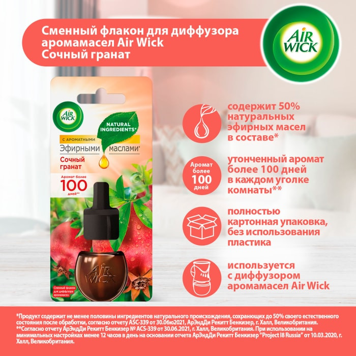 Сменный флакон к диффузору аромамасел «Air wick» наполнит Ваш дом ароматом, вдохновленным самой природой, который длится день за днем. Ощутите аромат дикого граната у себя дома вместе с «Air Wick»!