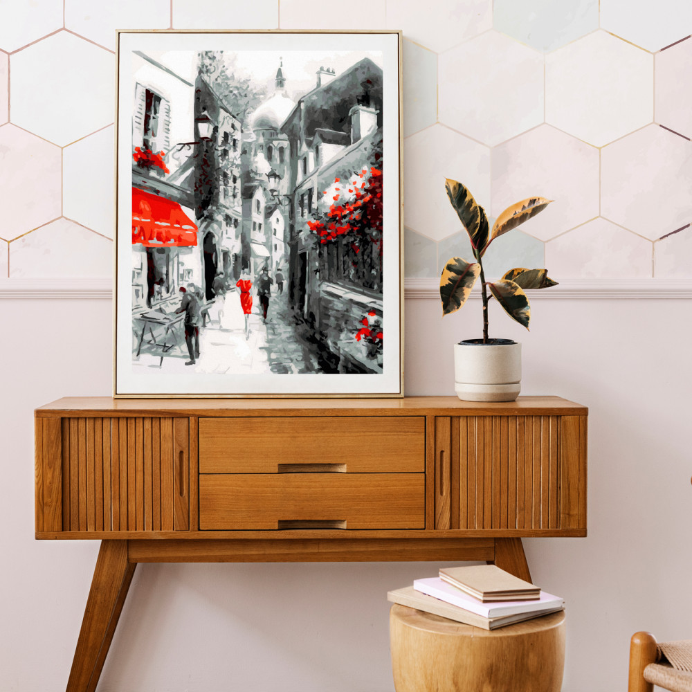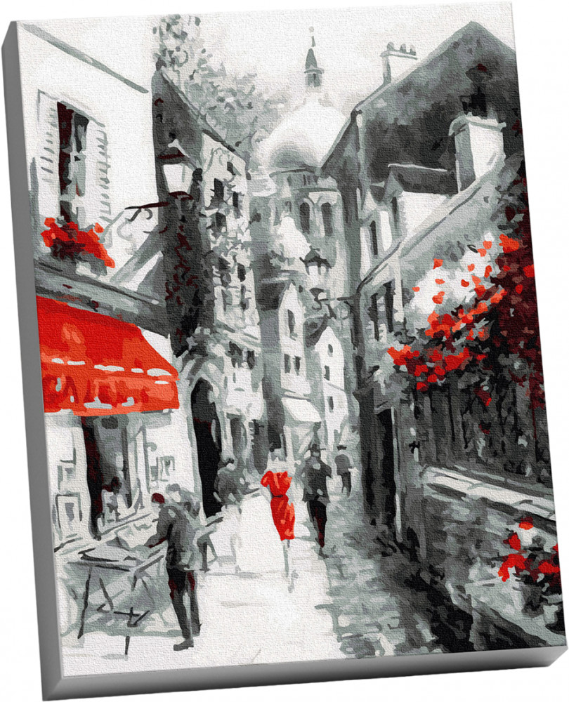 Используя набор для рисования «Улочка старого города», можно нарисовать городской пейзаж, где запечатлена часть узкой улицы. Особенно интересно цветовое решение картины: белый и оттенки серго — это основные цвета при создании картины.