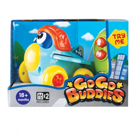Самолет серии "GO GO Buddies" на дистанционном управлении - это яркая желто-голубая игрушка, которая станет для Вашего малыша самым настоящим приятелем по играм! Управлять им очень легко. На пульте управления находится 2 кнопки, которыми малыш приводит самолет в движение. Нажатие на кнопку со стрелкой заставляет самолет двигаться вперед со звуком реактивного двигателя; нажатие на изображение самолета поднимает его шляпку и движет крылья.