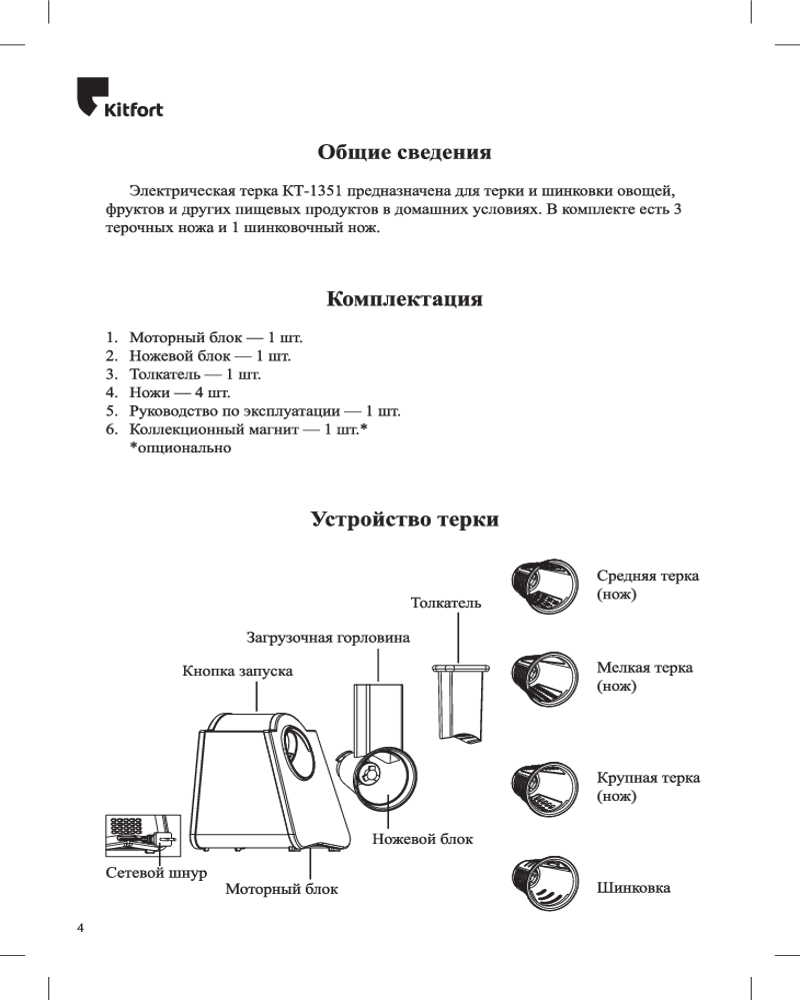 Прибор предназначен для тёрки и шинковки овощей, фруктов и других пищевых продуктов в домашних условиях. В комплекте есть 3 тёрочных ножа и 1 шинковочный нож.