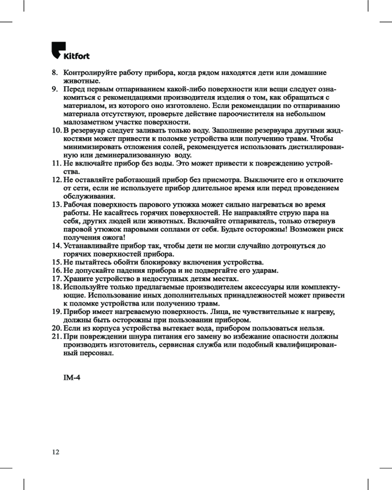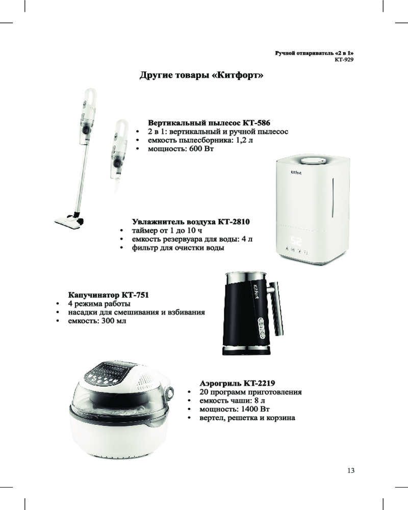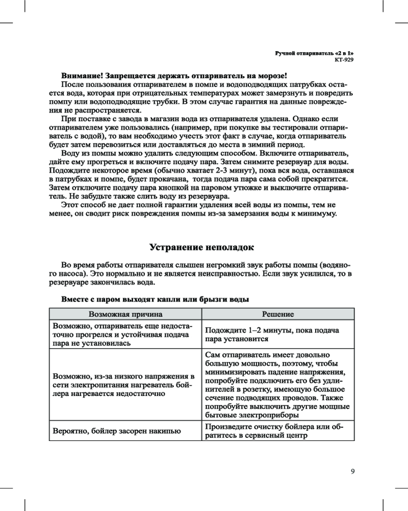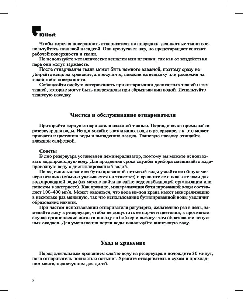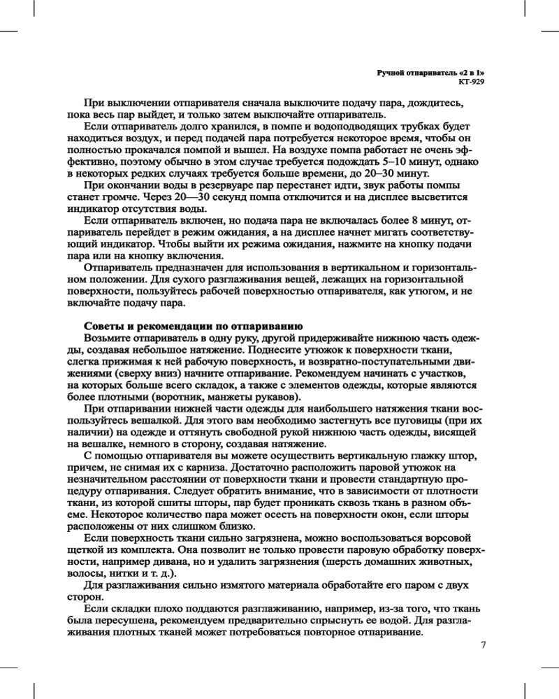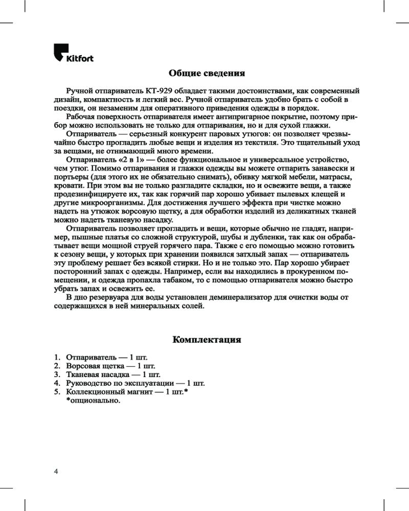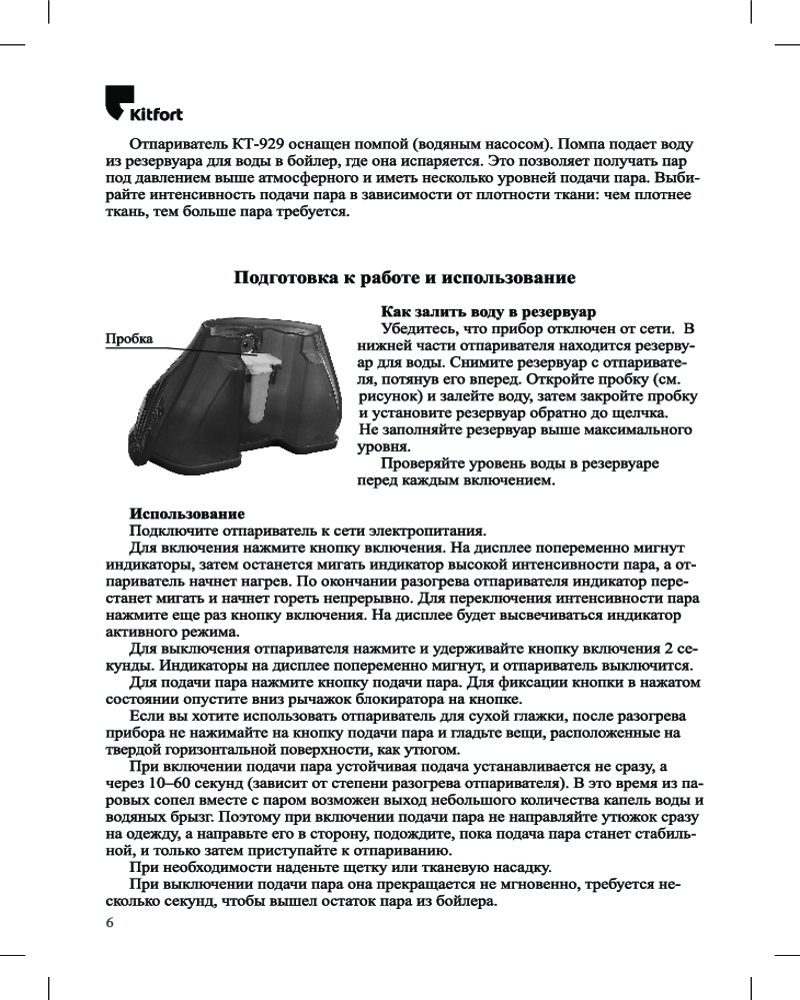 Kitfort КТ-929 оснащен помпой (водяным насосом). Это позволяет получать пар под давлением выше атмосферного, иметь два уровня подачи пара для ткани разной плотности, отпаривать не только вертикально, но и горизонтально. Кнопка подачи пара фиксируется.