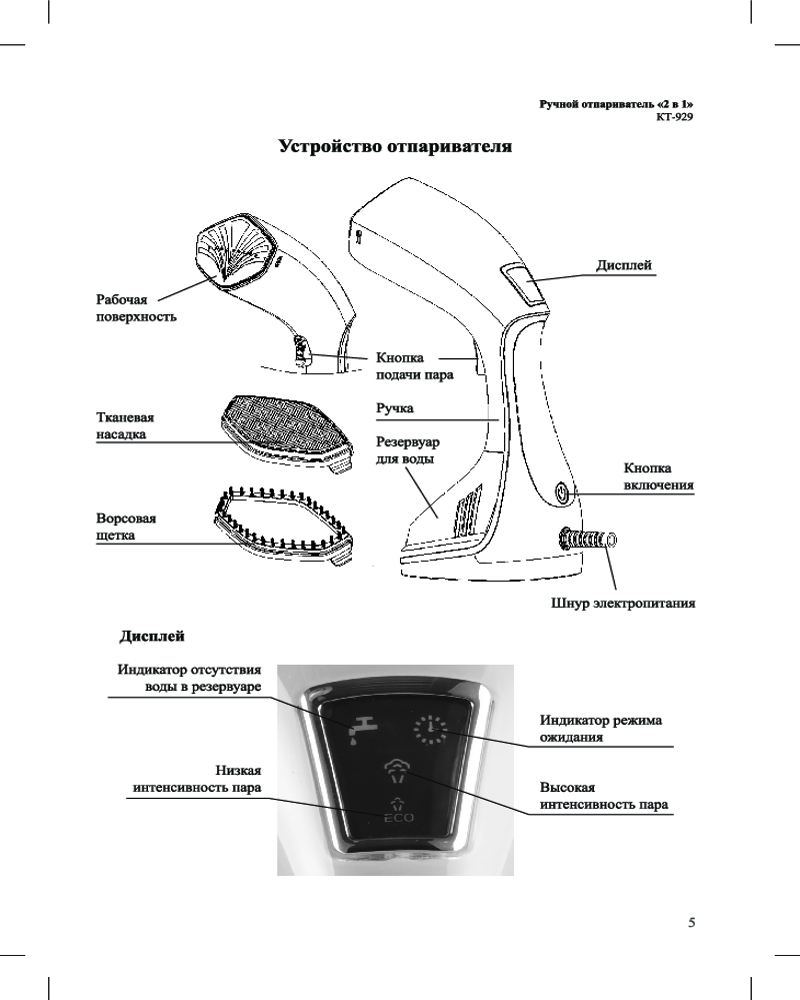 На цифровом дисплее отпаривателя есть индикаторы отсутствия воды, интенсивности пара и индикатор режима ожидания.