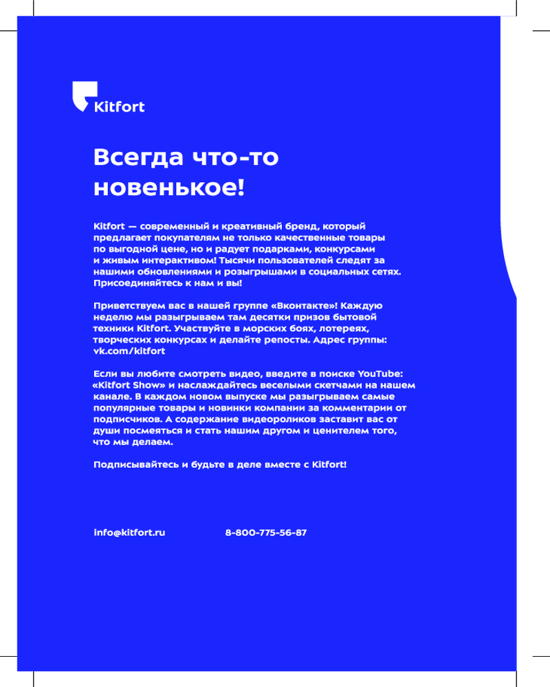 Российский бренд Kitfort занимает лидирующие позиции на рынке бытовой техники для кухни и дома. Основанная в 2011 году в городе Санкт-Петербурге, компания Kitfort стремится предоставить своим клиентам передовые технологии и инновационные решения для повседневных задач и создания комфортного пространства в доме.
