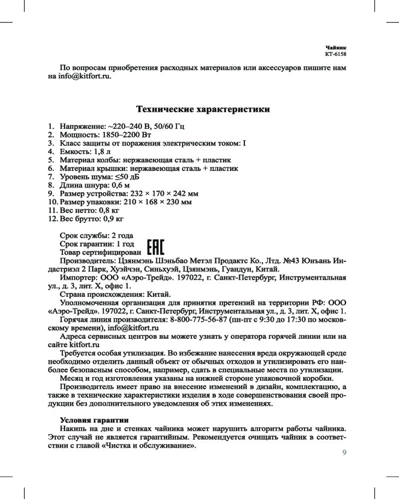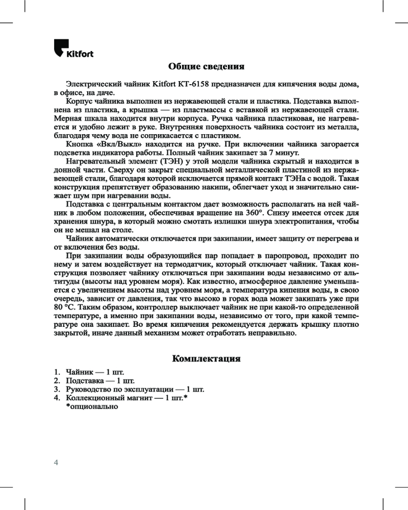Электрический чайник Kitfort КТ-6158 предназначен для кипячения воды дома, в офисе, на даче. Корпус чайника выполнен из нержавеющей стали. Чайник автоматически отключается при закипании, имеет защиту от перегрева и от включения без воды. Ёмкость 1,8 л.