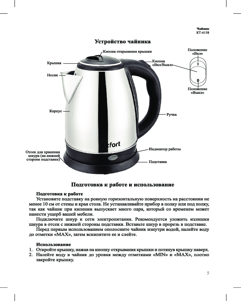 Подставка с центральным контактом дает возможность располагать на ней чайник в любом положении, обеспечивая вращение на 360°. Снизу имеется отсек для хранения шнура, в который можно смотать излишки шнура электропитания, чтобы он не мешал на столе.