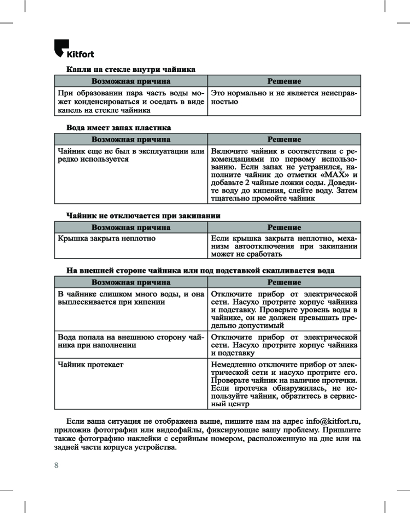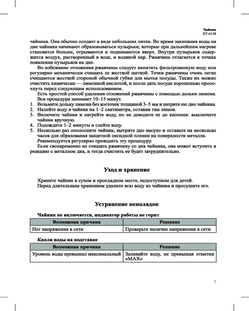 Для увеличения срока службы чайника своевременно удаляйте накипь. Поместите в чайник специальное средство, залейте 0,5 л воды и доведите до кипения. После вскипятите в нем воду и слейте её. Для предотвращения накипи используйте фильтрованную воду.
