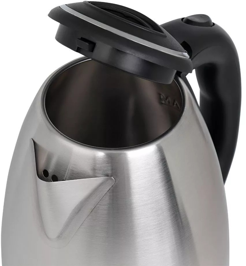 Крышка чайника выполнена из пластмассы с вставкой из нержавеющей стали. Мерная шкала находится внутри корпуса. Чайник имеет большое горлышко, что облегчает доступ внутрь при мытье.