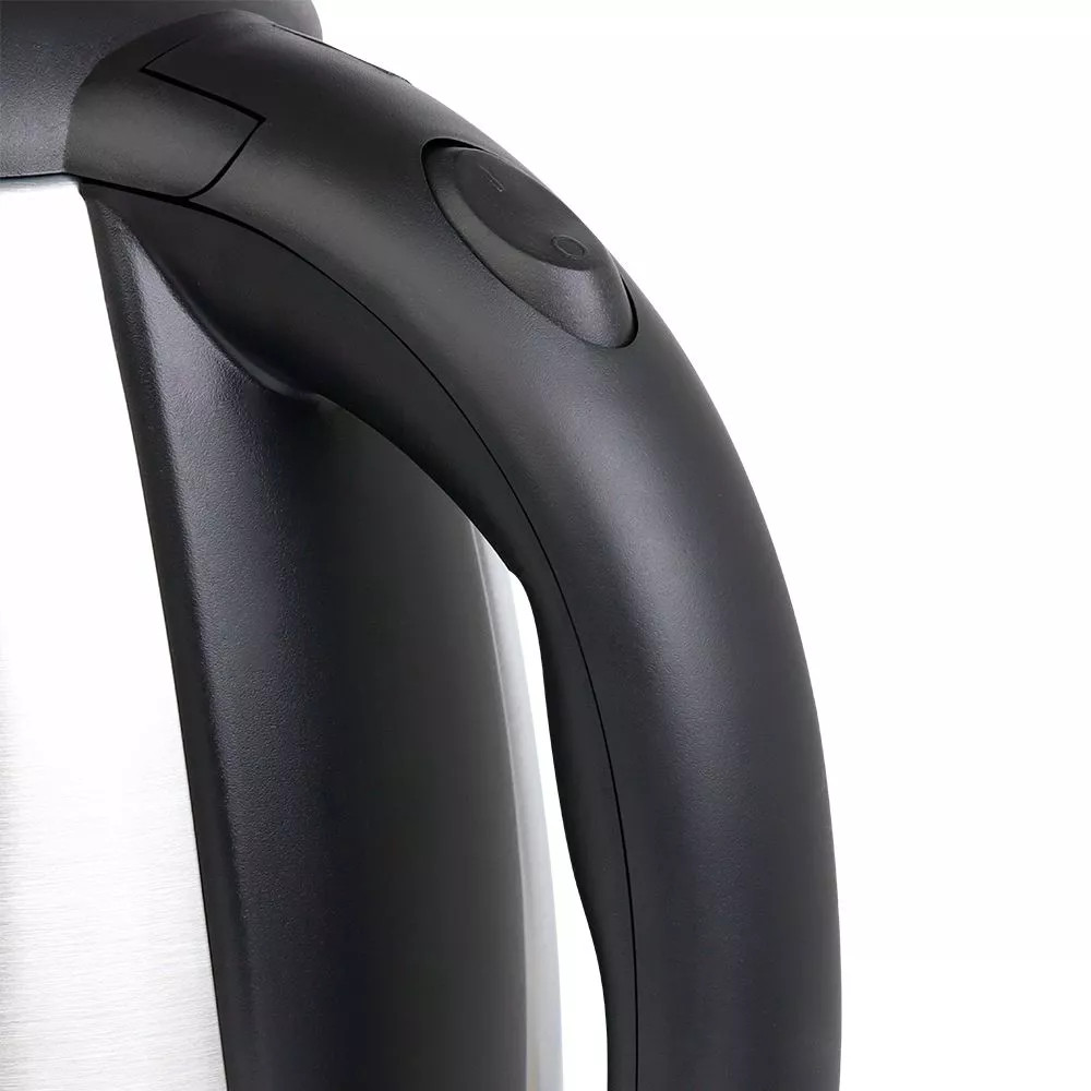 Кнопка «Вкл/Выкл» находится на ручке. При включении чайника загорается подсветка индикатора работы. Ручка чайника пластиковая, не нагревается и удобно лежит в руке. Полный чайник закипает за 7 минут.