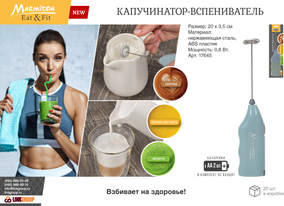 Marmiton Капучинатор-вспенивательмощность хорошая пенка функциональность хлипкий корпус В данный момент этот товар отсутствует в продаже. Возможно, у нас найдется аналогичный или похожий товар здесь. Капучинатор-вспениватель прекрасно взобьёт пышную молочную пену для капучино, кофе латте, горячего шоколада, какао. Сделать это можно за считанные минуты, затратив минимум усилий. Мощность 0,8 Вт. |