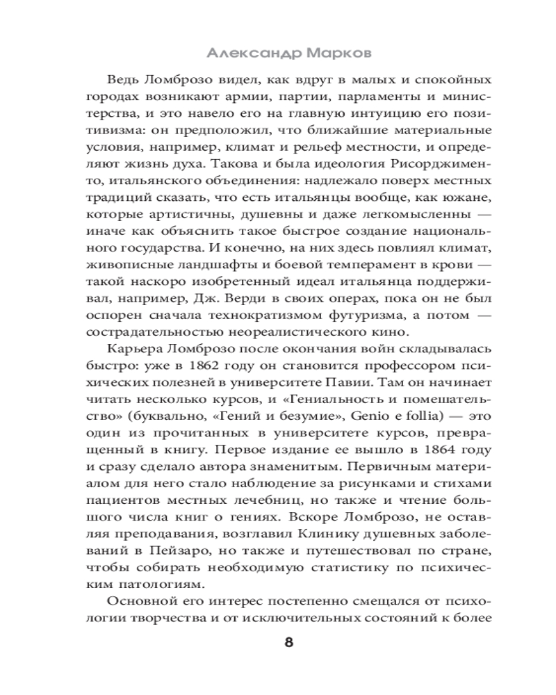 💳 Оплатить за товар можно при получении 🇰🇿 Есть бесплатная доставка по Казахстану 🎁 Копите бонусы с каждой покупки Серия: Популярная философия с иллюстрациями Чезаре Ломброзо — крупнейший итальянский философ-позитивист, психиатр и профессор судебной медицины. Центральной темой его главного труда «Гениальность и помешательство» стала идея о прирожденном преступнике. Ломброзо считал, что преступления совершают люди с набором определенных внешних данных и психологических характеристик. Будучи родоначальником оригинальной концепции творчества как сочетания патологических состояний, Ламброзо объяснял вдохновение как неразумное использование психической энергии, которое порождает оригинальные результаты и способствует прогрессу культуры. Его идеи и научные исследования оказали заметное влияние на развитие таких наук как криминология, психопатология творчества и позитивистская антропология. Все тексты снабжены подробными комментариями и разъяснениями профессора РГГУ А.В. Маркова. |